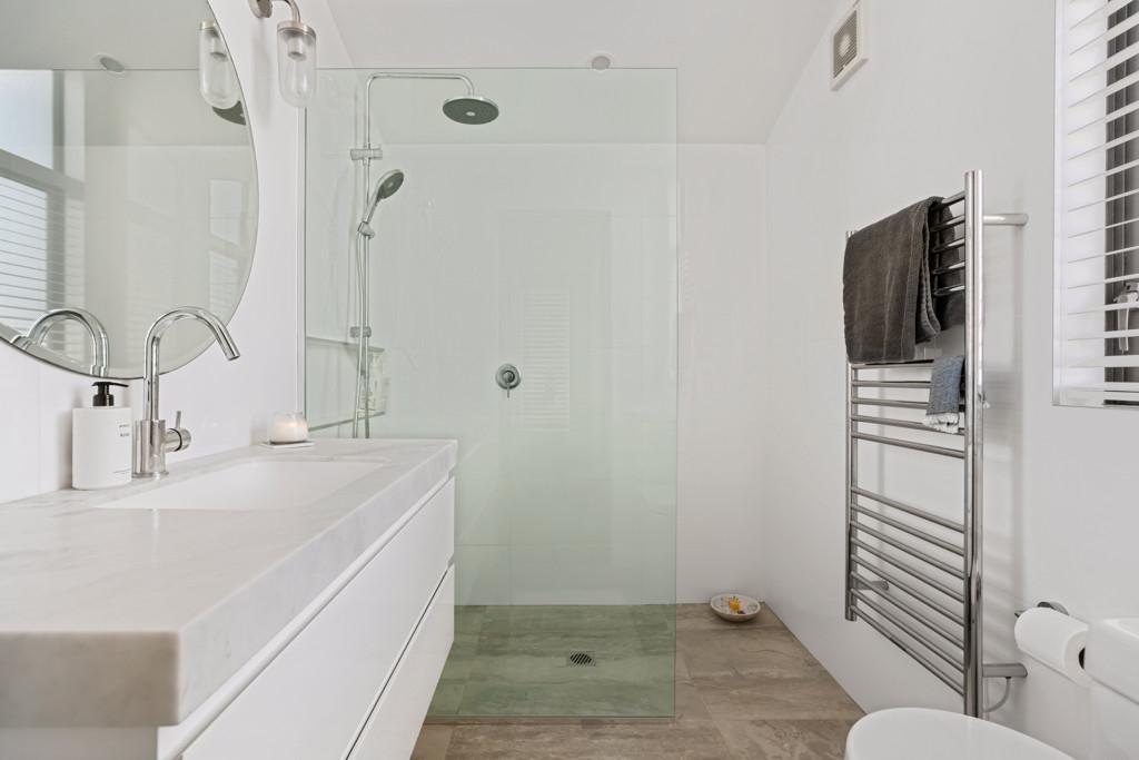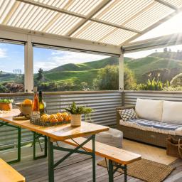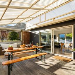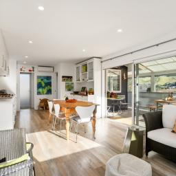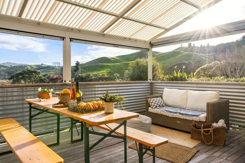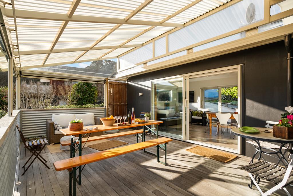 The open-plan living connects seamlessly to the outdoors, where a covered deck with slide-down screens creates a sheltered entertaining area for year-round enjoyment.