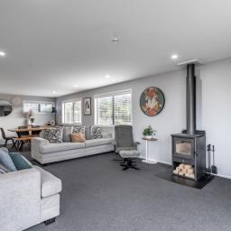 Inside, the light-filled open-plan living area immediately captures attention. Expansive windows frame the stunning coastal vistas, while full insulation, double glazing, and a feature fireplace create warmth and comfort in every season. The stylish kitchen, complete with a generous island bench, excellent storage, and gas cooking, provides the perfect hub for everyday living and effortless entertaining.