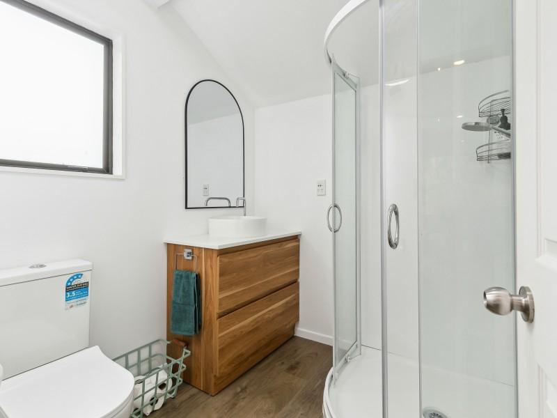 The mid-level is the heart of the home, where expansive windows frame the outlook and open-plan living and dining areas flow seamlessly to a balcony and wrap-around deck – perfect for entertaining or relaxing while enjoying the view. The kitchen offers excellent bench space and storage, while a guest toilet on this level adds everyday convenience.