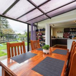 Step inside and you are greeted by a thoughtful, functional layout featuring three spacious bedrooms, a full family bathroom, separate toilet and a dedicated laundry. The open plan kitchen, dining and living area forms a warm central hub that extends into a bright conservatory, creating an inviting extra space for gatherings, quiet relaxation, hobbies or a playroom. Year round comfort is well taken care of with two heat pumps, a cosy wood burner and an HRV system. The wood burner also includes a wetback, helping heat the hot water cylinder and offering an efficient way to reduce power costs when the fire is going.