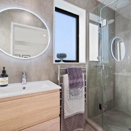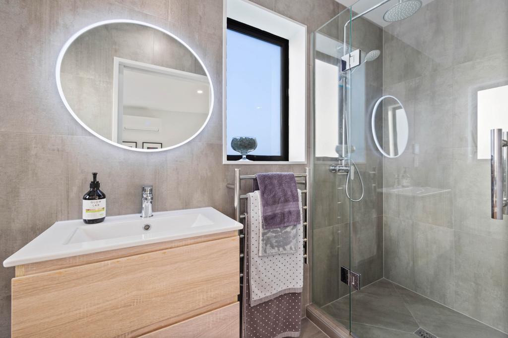 There are three double bedrooms each having their own ensuite all with underfloor heating. The main bedroom has a walk-in wardrobe and flows to a deck that enjoys a sea view, the perfect spot for an evening sundowner. The lower level offers a second lounge or office, the perfect work from home space.