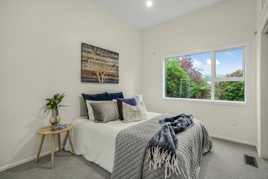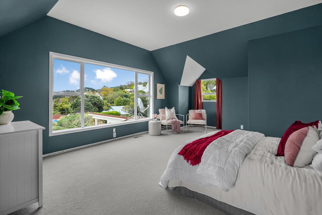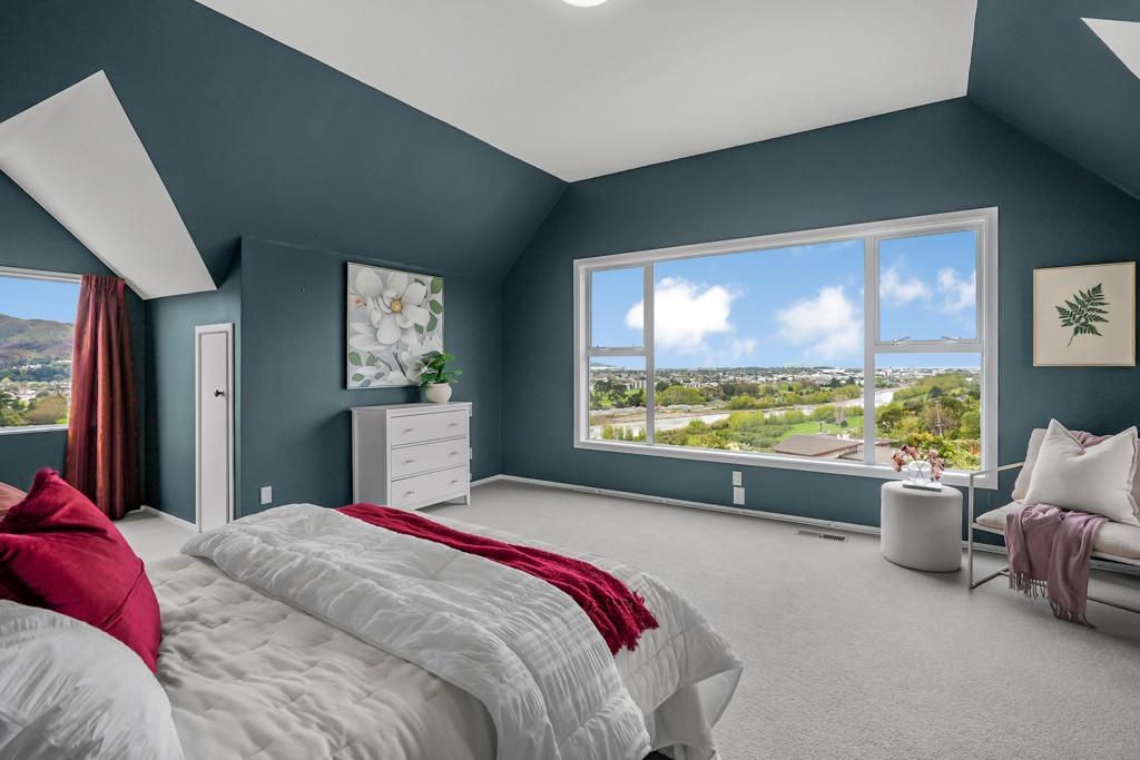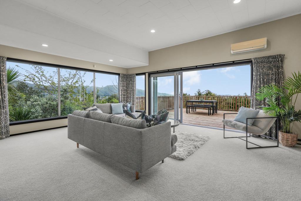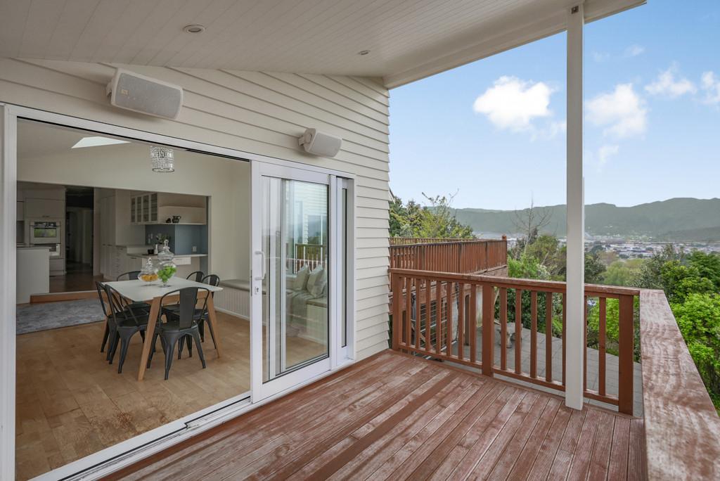 The main living level has been designed for family life and entertaining. It features two generously sized bedrooms, a well-appointed family bathroom with a separate toilet, and three distinct living areas, ensuring everyone has their own space to relax. At its heart, the open-plan kitchen and dining area flows effortlessly onto a huge deck. From here, soak in panoramic views over the harbour and across the Hutt Valley, the perfect backdrop for summer barbecues, evening sunsets, and family gatherings.