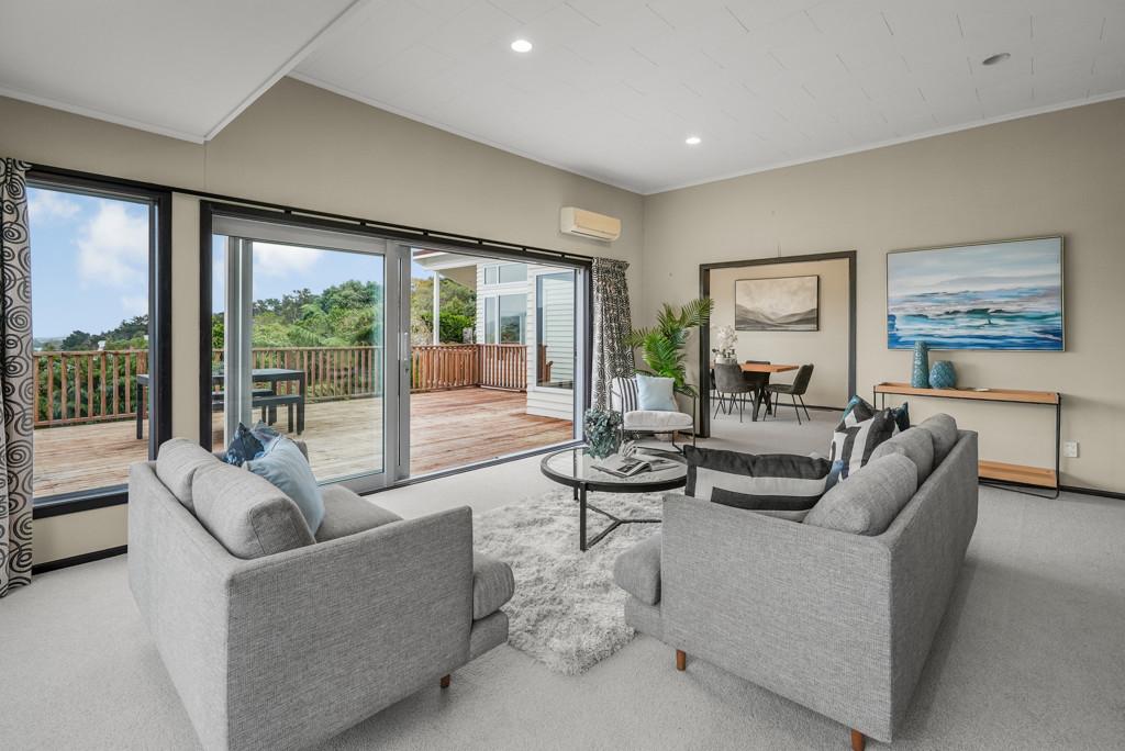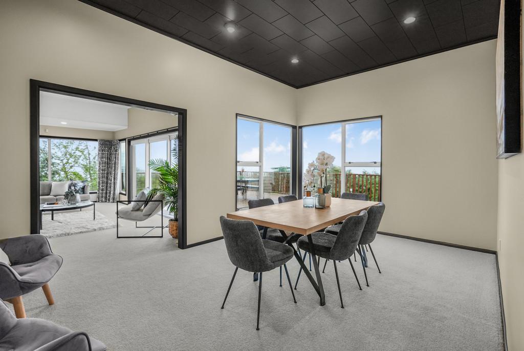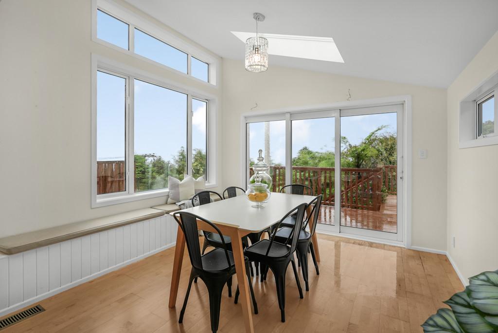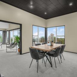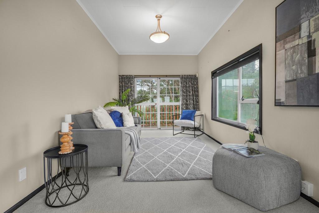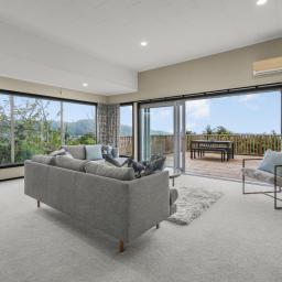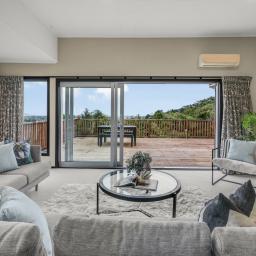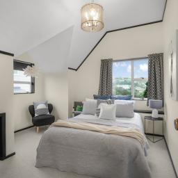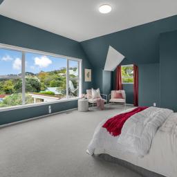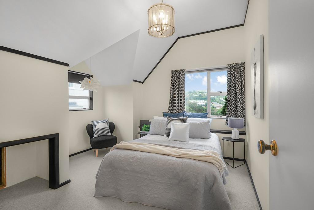 The main living level has been designed for family life and entertaining. It features two generously sized bedrooms, a well-appointed family bathroom with a separate toilet, and three distinct living areas, ensuring everyone has their own space to relax. At its heart, the open-plan kitchen and dining area flows effortlessly onto a huge deck. From here, soak in panoramic views over the harbour and across the Hutt Valley, the perfect backdrop for summer barbecues, evening sunsets, and family gatherings.
