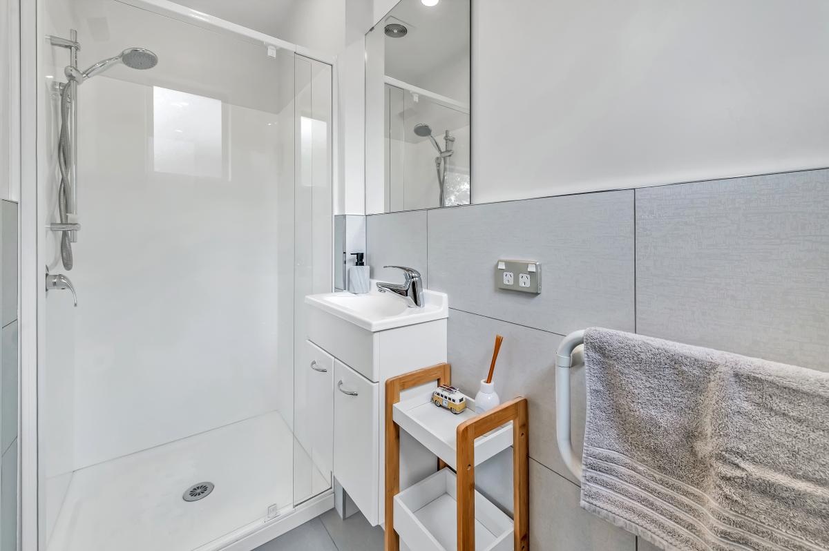 The ground floor showcases an open-plan living area, seamlessly connecting the kitchen, dining, and lounge spaces. The modern kitchen is a chef's delight, featuring tiled flooring, a microwave shelf, dishwasher, rangehood, and oven. Stay cozy year-round with the efficient heat pump system.