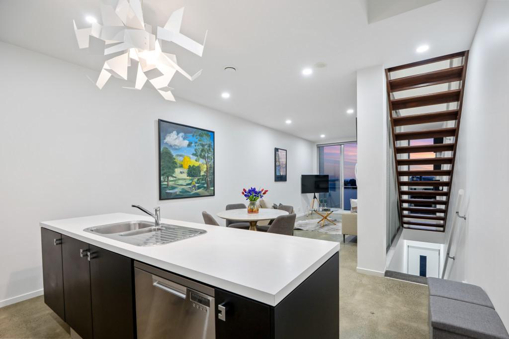 Spacious Open-Plan Living: Sun-filled kitchen, dining, and living areas flow seamlessly to a private balcony with breathtaking panoramic views of Mount Eden.
