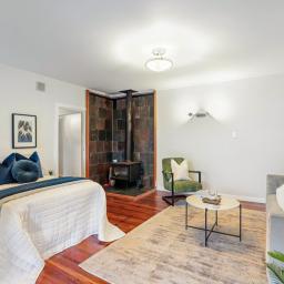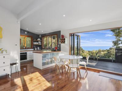 Outdoors, multiple deck zones offer both sun and seclusion. One captures elevated views reaching out toward the water, while another is tucked into native greenery for total privacy and an immersive atmosphere surrounded by birdsong and nature. A restored studio provides valuable extra space for creative work or a work from home setup.