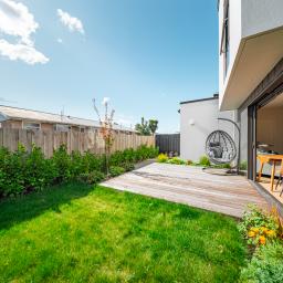 Inside, the home offers two double bedrooms and two bathrooms, with a well-appointed kitchen featuring gold fixtures and primestone benchtops flowing into the open-plan living space. Sliding doors connect seamlessly to a private courtyard with beautifully stained wooden decking, creating a secure and low-maintenance outdoor retreat.