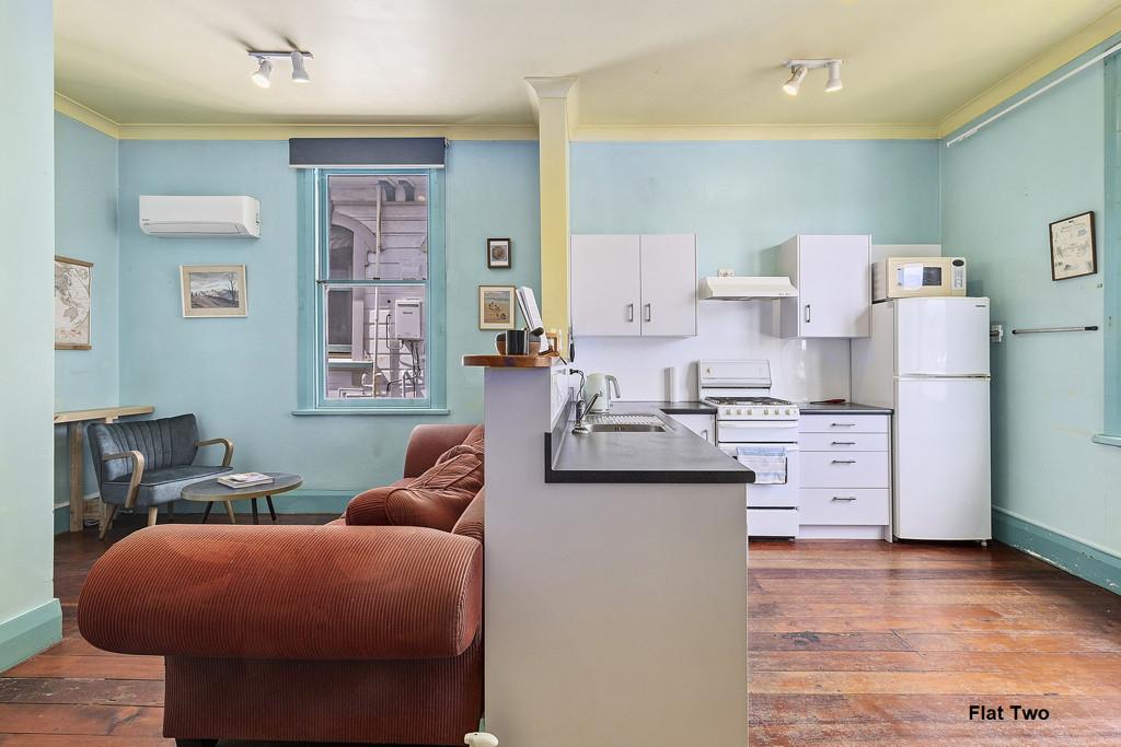 An upstairs one-bedroom apartment featuring a bathroom and open-plan kitchen and living. Currently returning $480 per week.