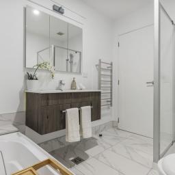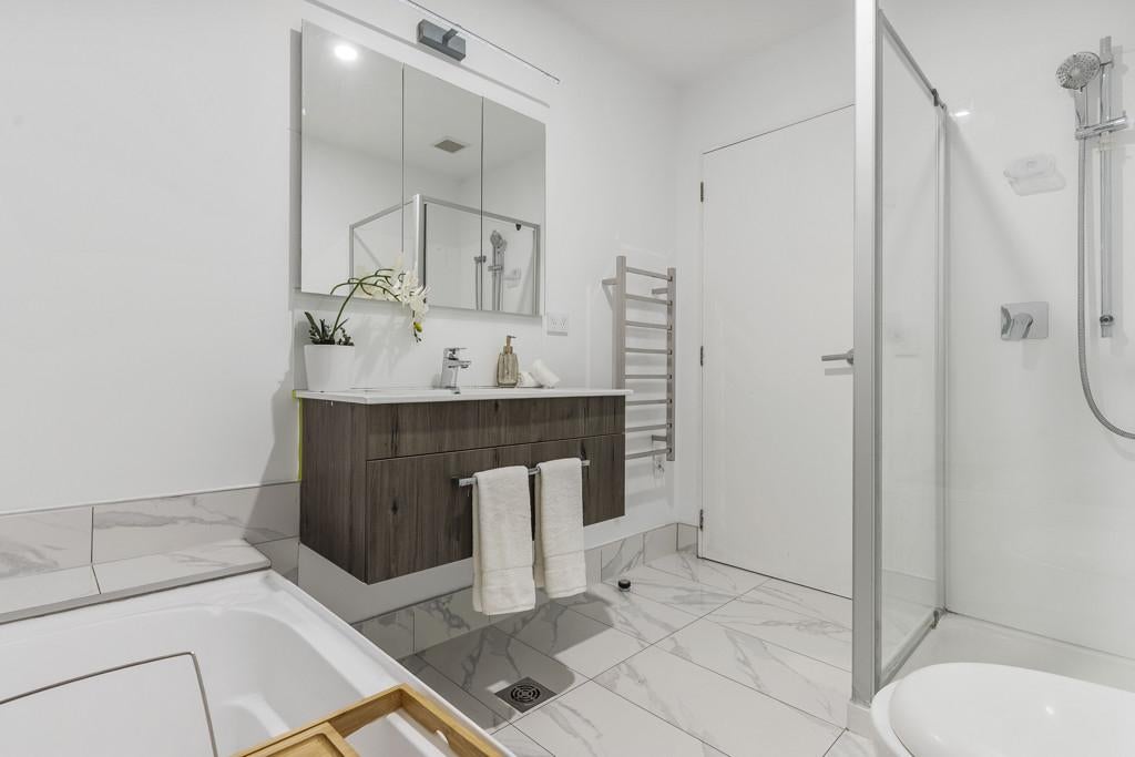 With a 107 sqm (approx.) two storey floor plan, the brick and weatherboard three-bedroom maisonette has spacious and sunny ground floor open plan living and dining complete with wall mounted heat pump. A chic and modern kitchen is neatly integrated and features honeycomb tile back splash harmonising with composite stone benchtops and stainless-steel appliances fitted into durable cabinetry. Bifold doors allow for easy flow to access the fully fenced rear courtyard where pets are safe, and the barbecue can be on standby ready to use for the coming summer's entertainment. Upstairs, three bedrooms are well served by a stylish Italianate bathroom with shower, vanity and toilet while the marble-look tile floor attractively extends to bathtub surround. Downstairs a bonus guest powder room is tucked beneath the stairs with separate laundry nook opposite.
