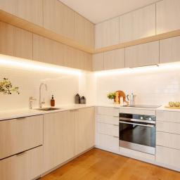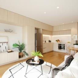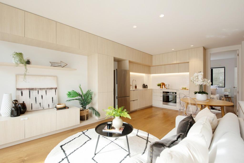 * Light-filled open-plan living and dining areas with engineered oak timber flooring and custom timber cabinetry
