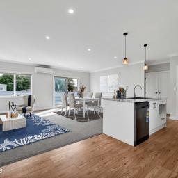 The bright, open-plan kitchen, dining, and lounge form a vibrant heart of the home, designed for seamless daily routines and easy entertaining. The living area flows effortlessly onto a sun-drenched, north-facing deck - your private spot for morning coffee or evening relaxation.