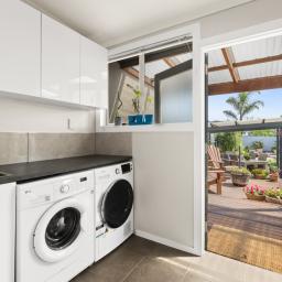 A feature barn door separates the vibrant living spaces from a cleverly integrated laundry area that combines practicality with contemporary design.