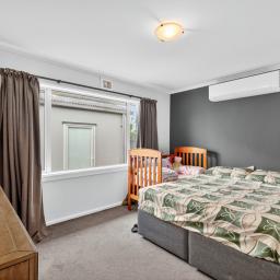 This home features 3 generously sized bedrooms. The master room has a built-in wardrobe & a heat pump for extra comfort. The light-filled tiled bathroom features a shower, a bathtub, perfect for young kids, and a heated towel rail. The large lounge space has wooden slat flooring and a heat pump for all-year comfort.