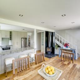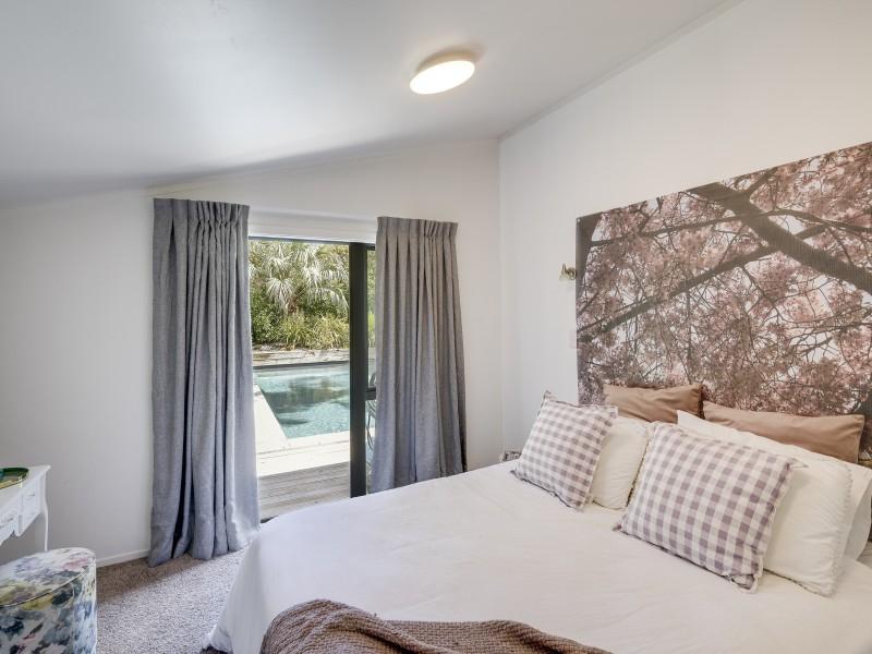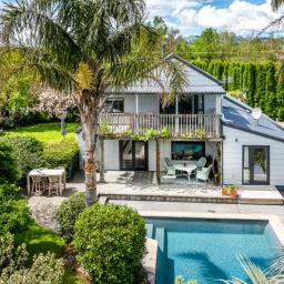 Privately set among established grounds, the inviting three or four-bedroom home offers flexible living - use the fourth room as an office, library, or extra bedroom. In summer, work might take a back seat with the glistening pool just steps away. The spacious kitchen and dining area overlook the garden, complemented by two living rooms. Two bedrooms and a bathroom are on the ground floor, while upstairs features the main bedroom overlooking the pool, another bedroom, and a second bathroom. Comfort is assured with a woodburner and heat pumps.