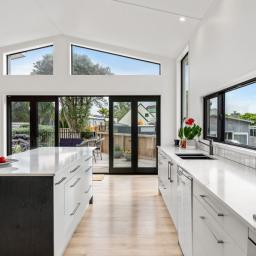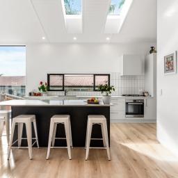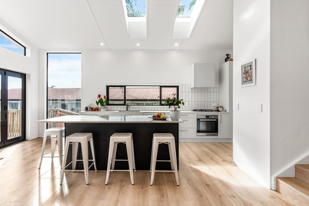 The modern kitchen and living area with high-stud ceilings and skylights offer natural light, flowing to a sunny north-facing deck and large grassed backyard - perfect for entertaining or family fun.