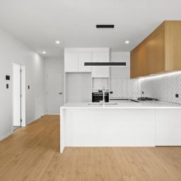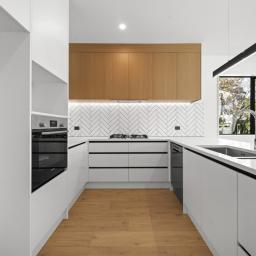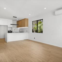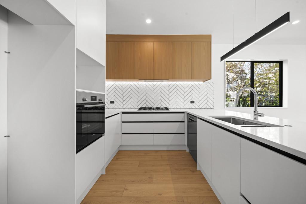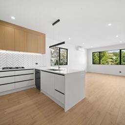The open-plan kitchen flows seamlessly into a spacious living and dining area, creating a welcoming space for family gatherings and everyday enjoyment.