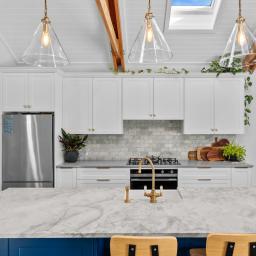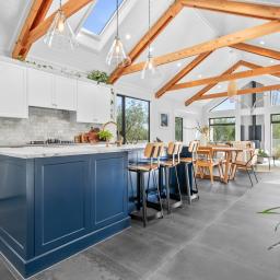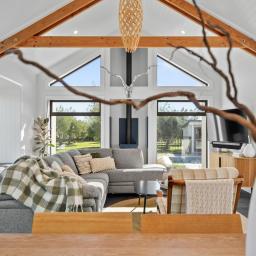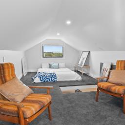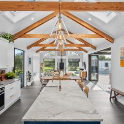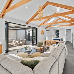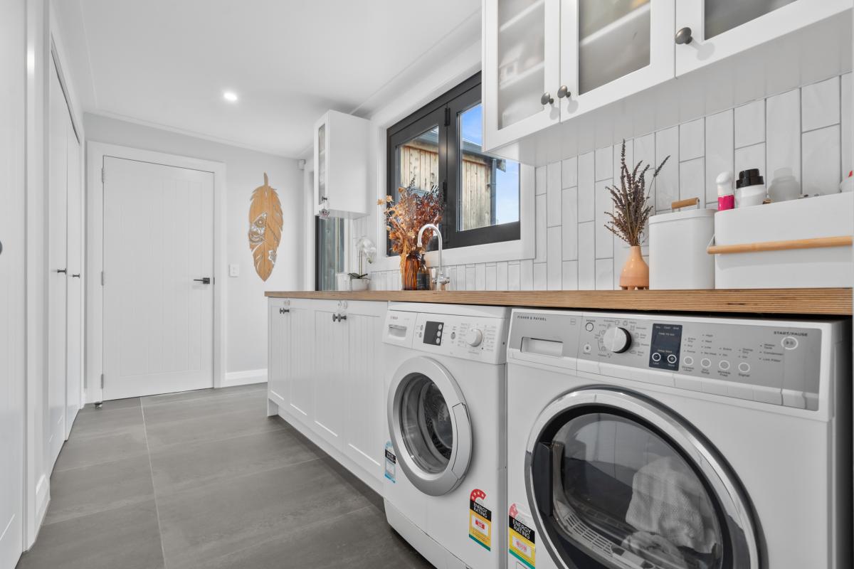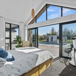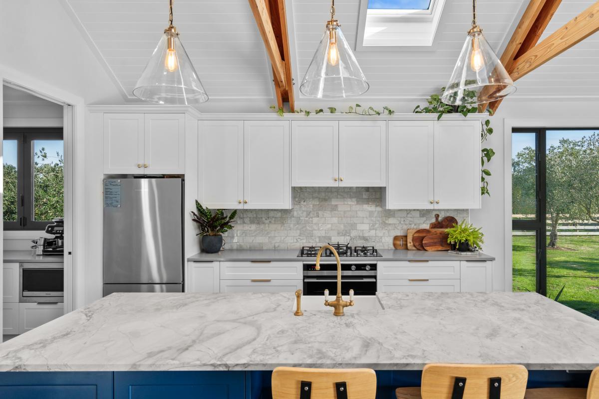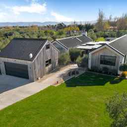 Inside, sophistication meets comfort with three generous bedrooms, including a serene primary suite with a walk-in wardrobe and elegant ensuite. The interiors showcase granite benchtops, Perrin & Rowe tapware, David Trubridge feature lighting, and untreated macrocarpa cladding — chosen not only for their beauty but for their enduring, low-maintenance quality.