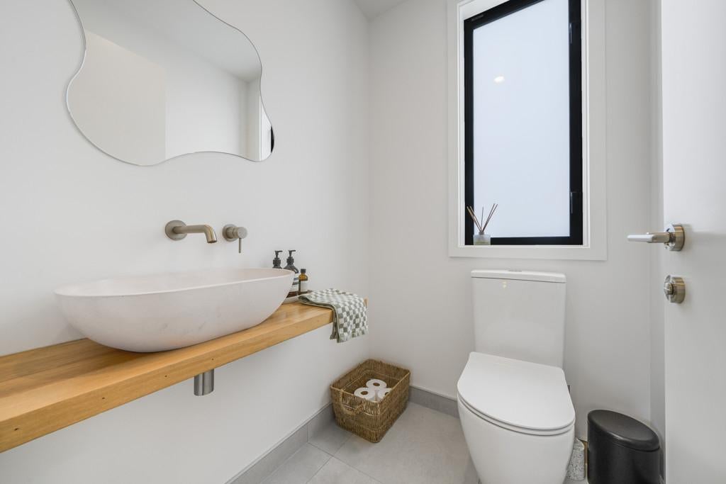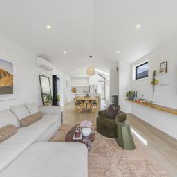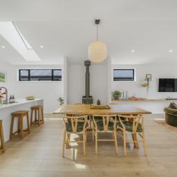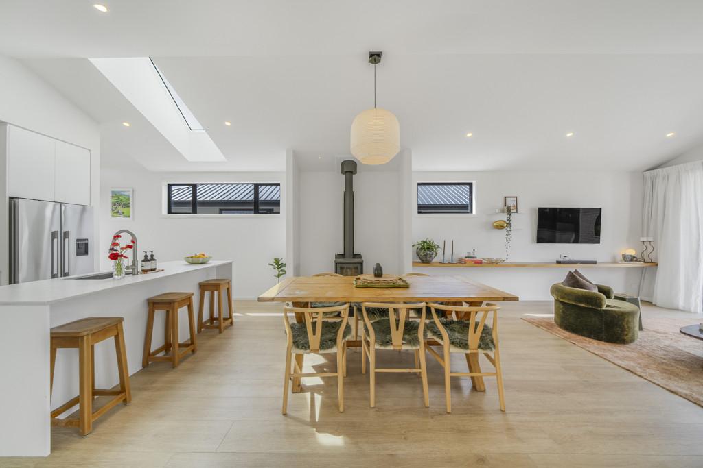 The open-plan kitchen, dining, and living area serves as the heart of the home - complete with a breakfast bar, generous butler's pantry, log burner, heat pump, and ducted heating for year-round comfort. The master suite offers a walk-in robe, ensuite, and private patio access, while a stylish family bathroom and separate powder room cater to guests or family.