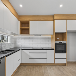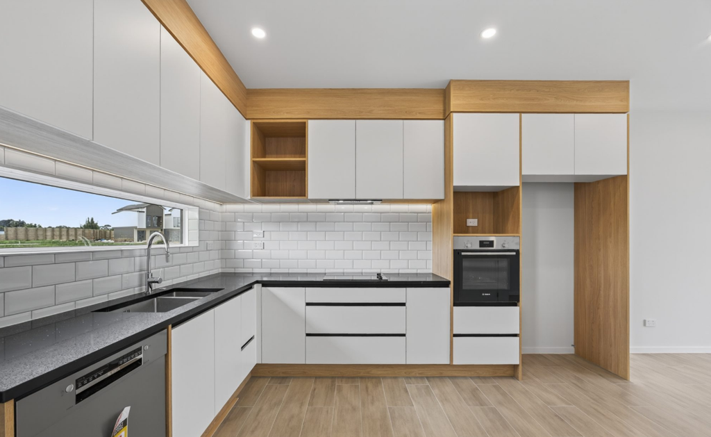 • L-shaped designer kitchen with oak/white cabinetry and black benchtops