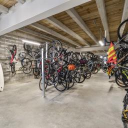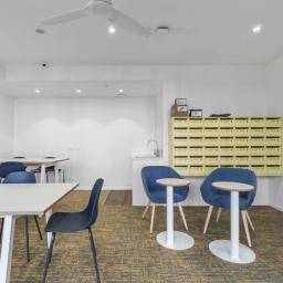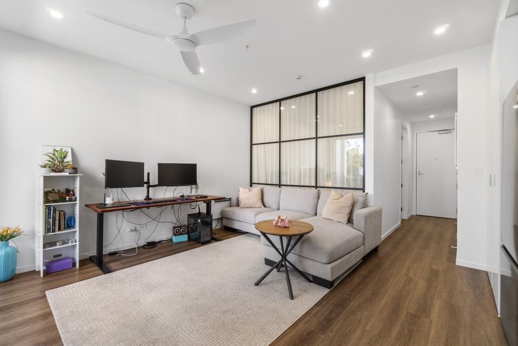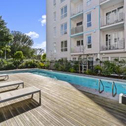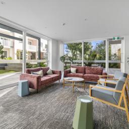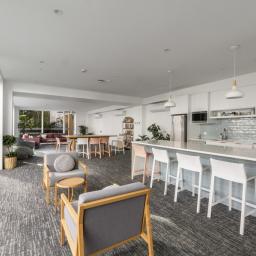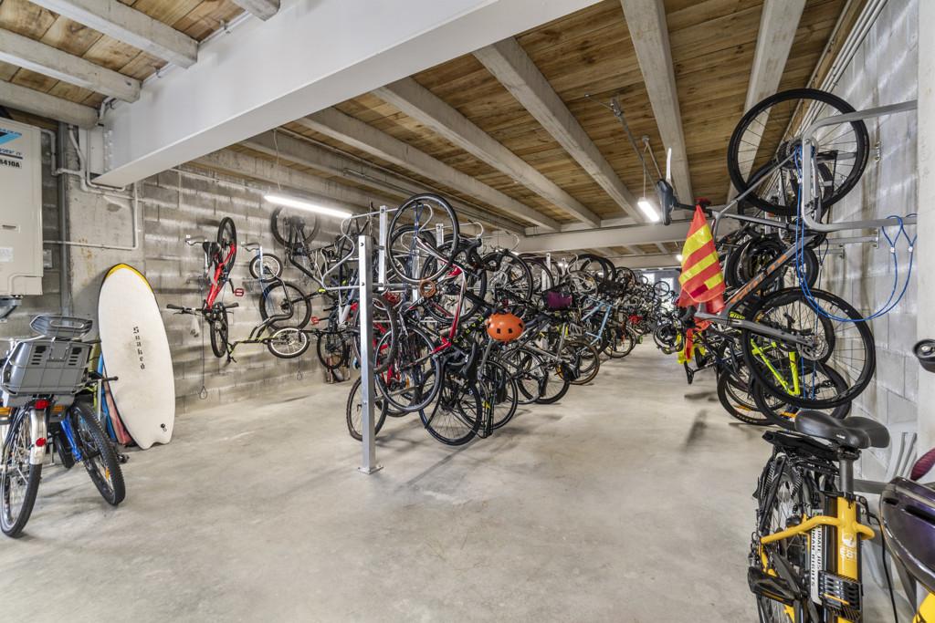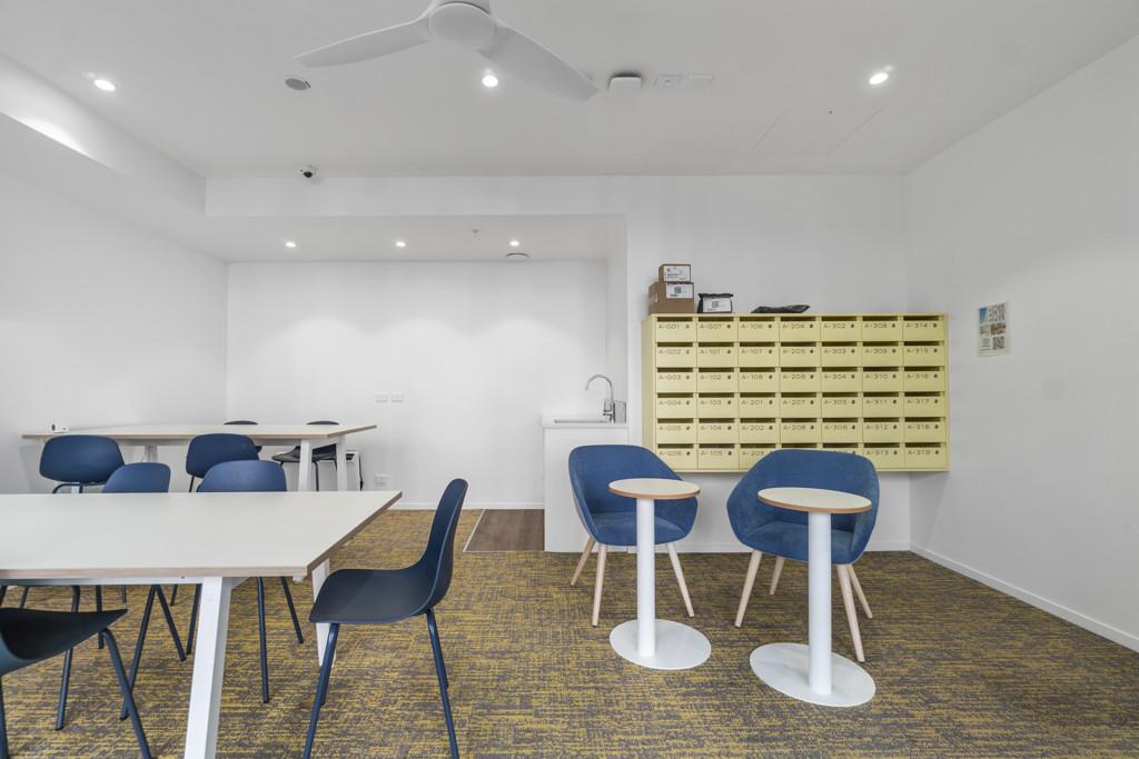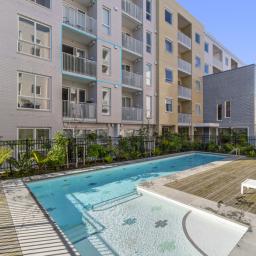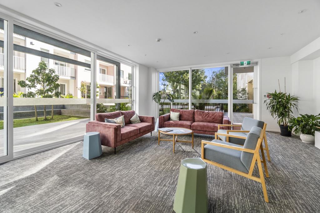 Enjoy resort-style amenities including a solar-heated pool, communal lounge and kitchen, shared workspaces, EV charging, and secure bike storage.