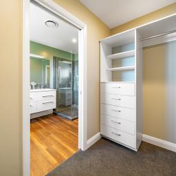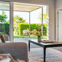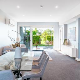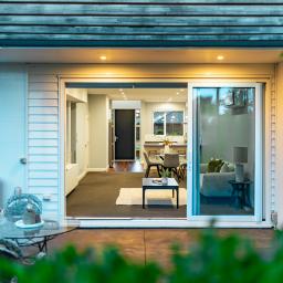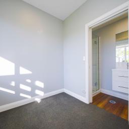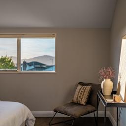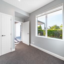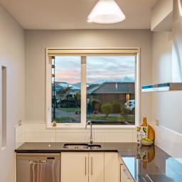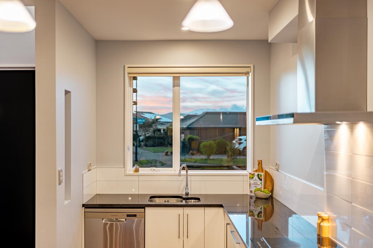 Sunlight fills the home from morning to evening. The open-plan layout creates a natural path from the entrance through the kitchen, dining, and living areas, before spilling through large sliding doors into the private courtyard. The entertainer’s kitchen features a granite benchtop, modern appliances, and views of the Port Hills that glow with the sunrise. Two heat pumps keep the home comfortable year-round, while the internal-access garage provides convenience and security from a quiet street.