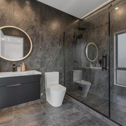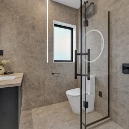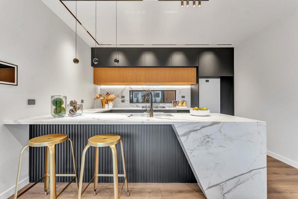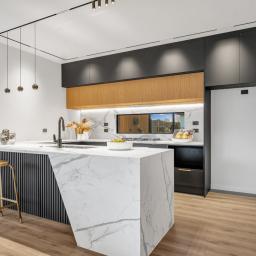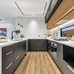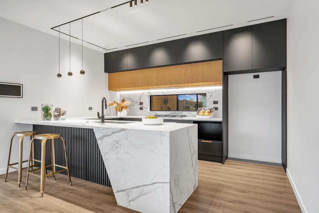 • Kitchen: Premium stone benchtops; stone splashback; grey mirrored feature wall