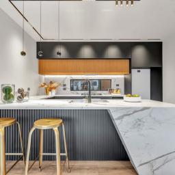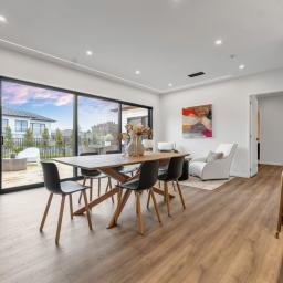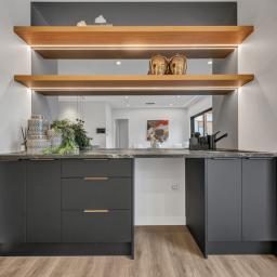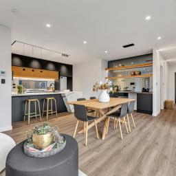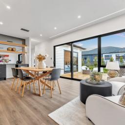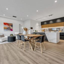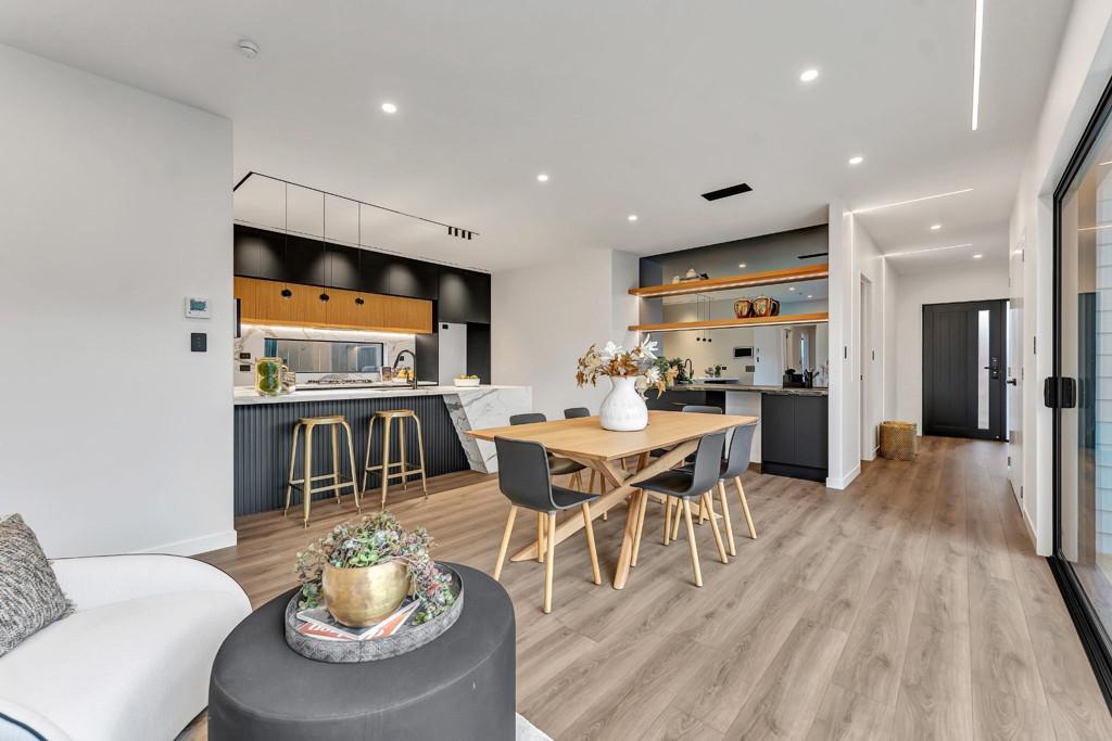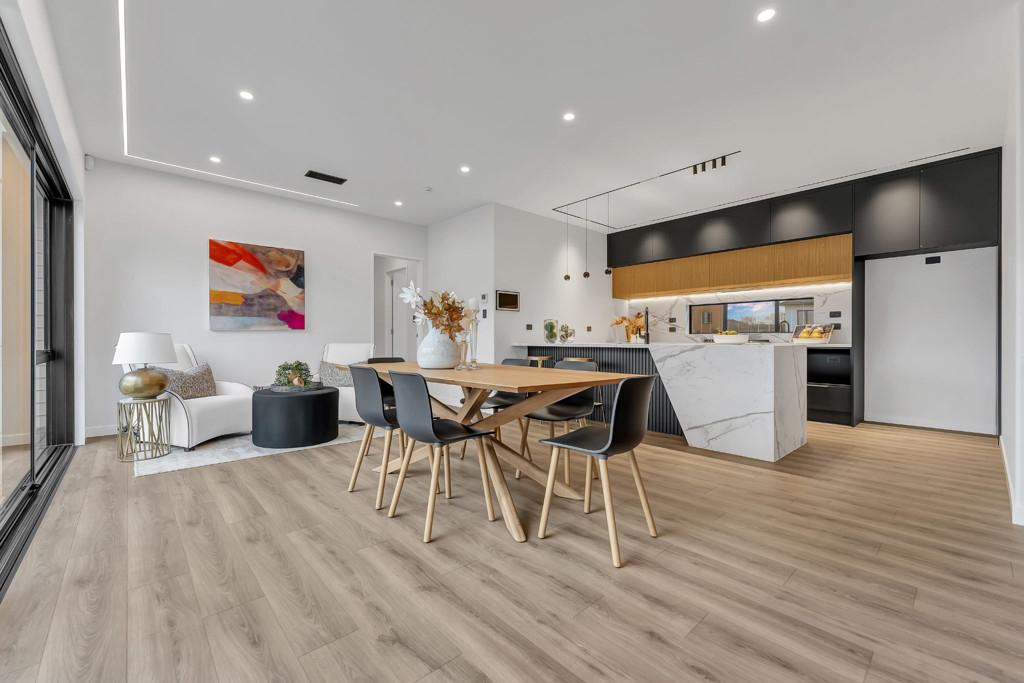 The single-level layout is designed for easy living: an elegant designer kitchen sits at the heart of open-plan dining and family areas, finished with premium benchtops, matching splashbacks, and a striking grey mirrored feature wall that enhances light and depth.