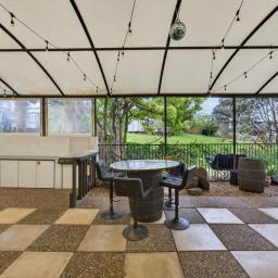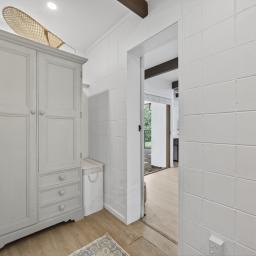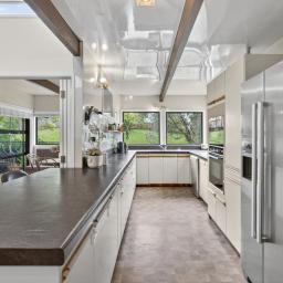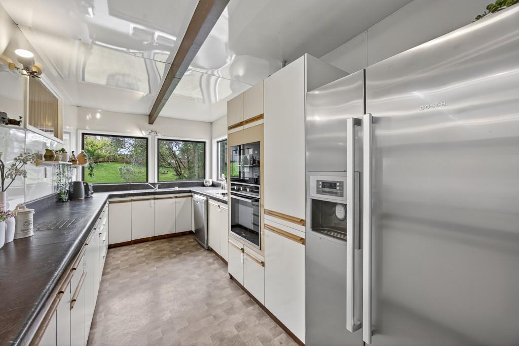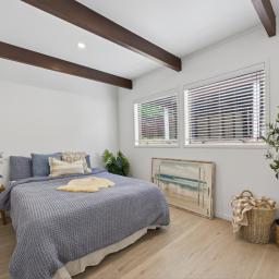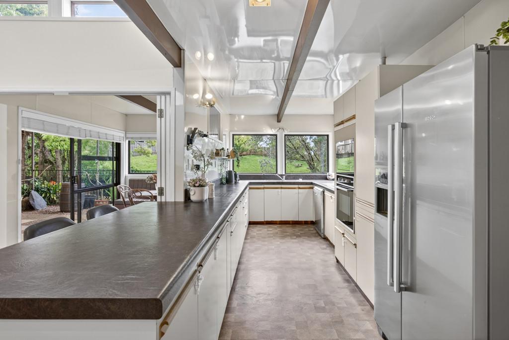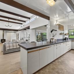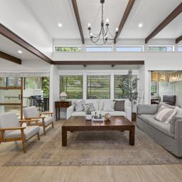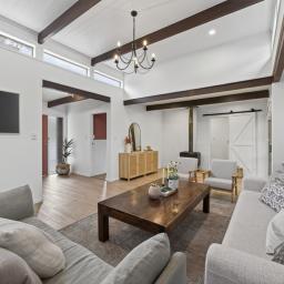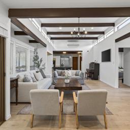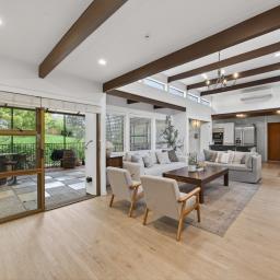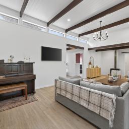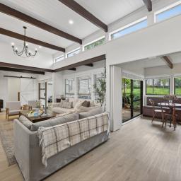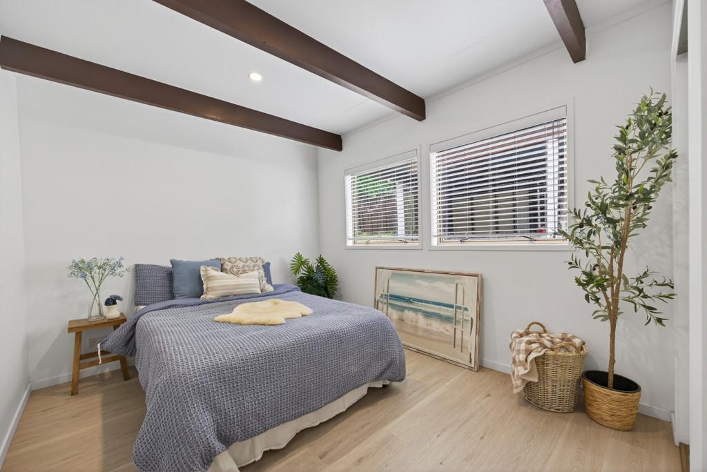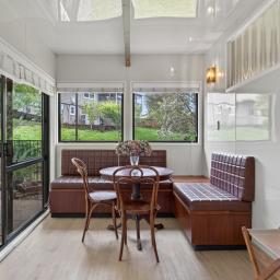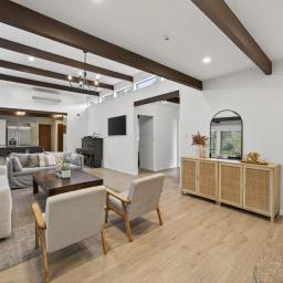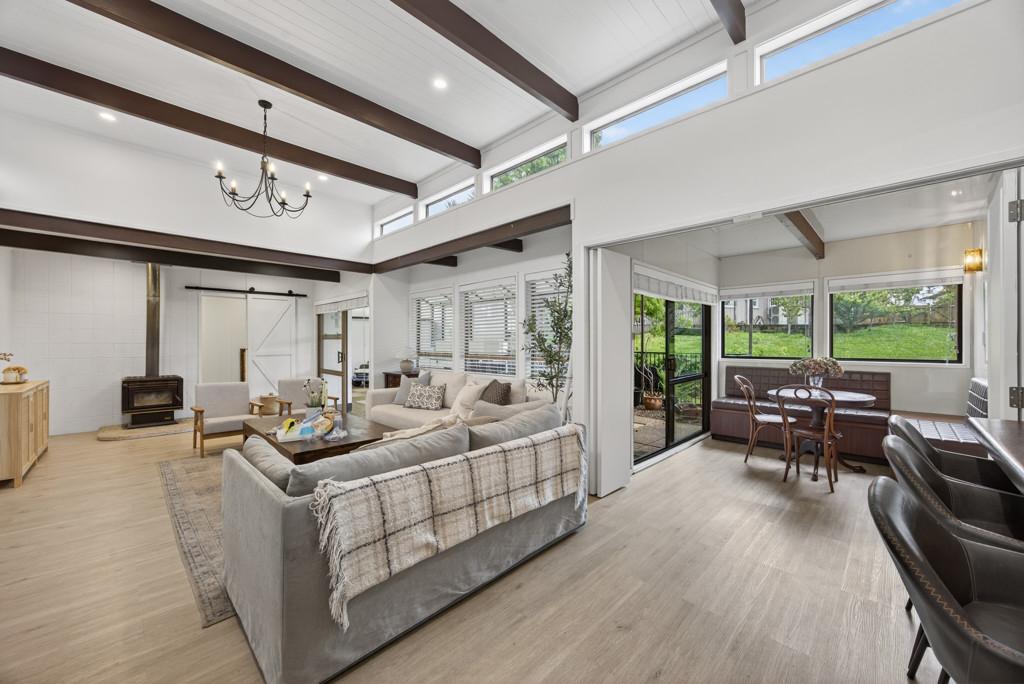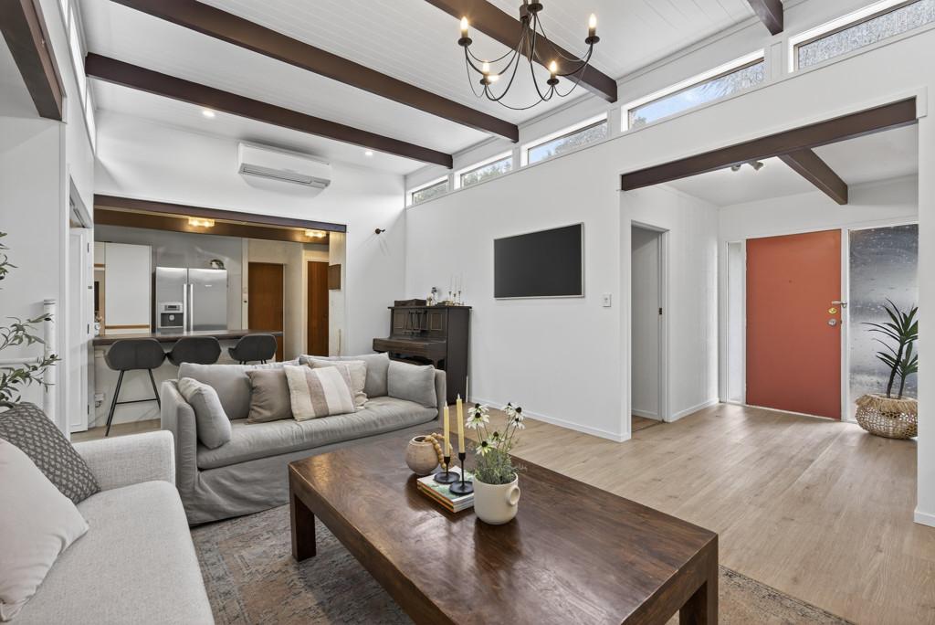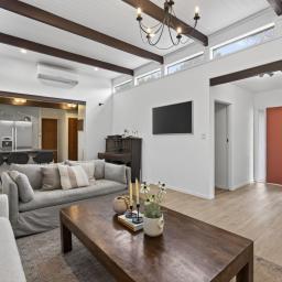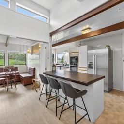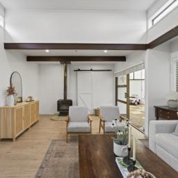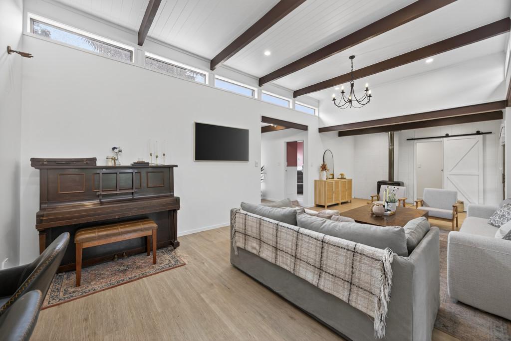 The open-plan living zone feels light and airy, enhanced by exposed beams and picture windows that fill the space with natural light. The well-equipped kitchen connects beautifully to both the family area and the outdoor entertaining space, while the built-in dining nook adds a touch of retro character.