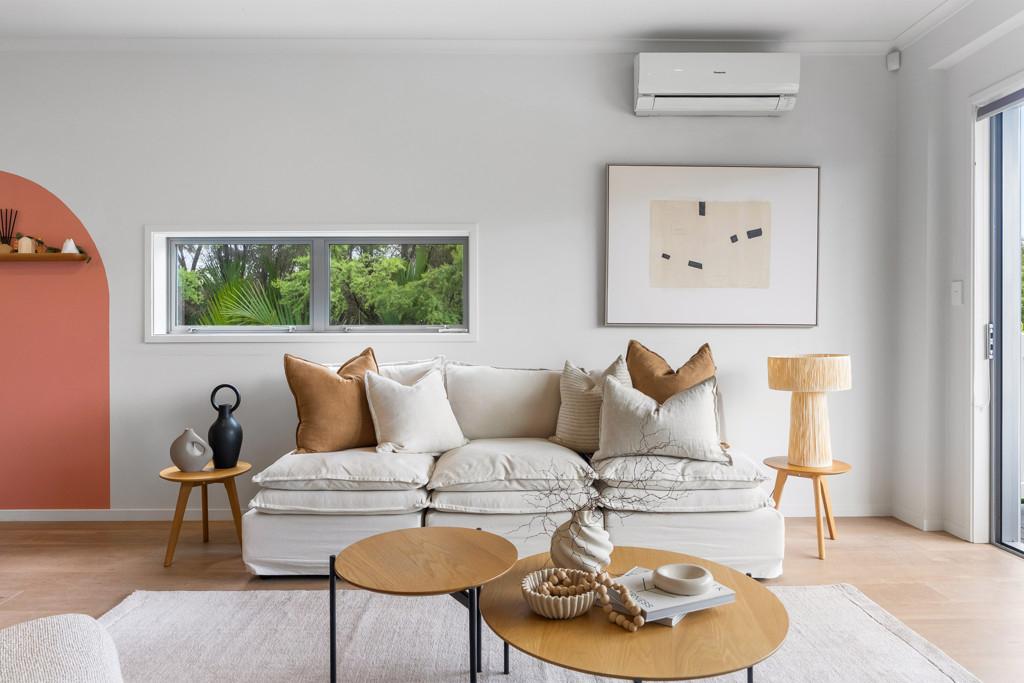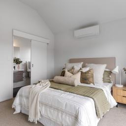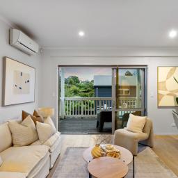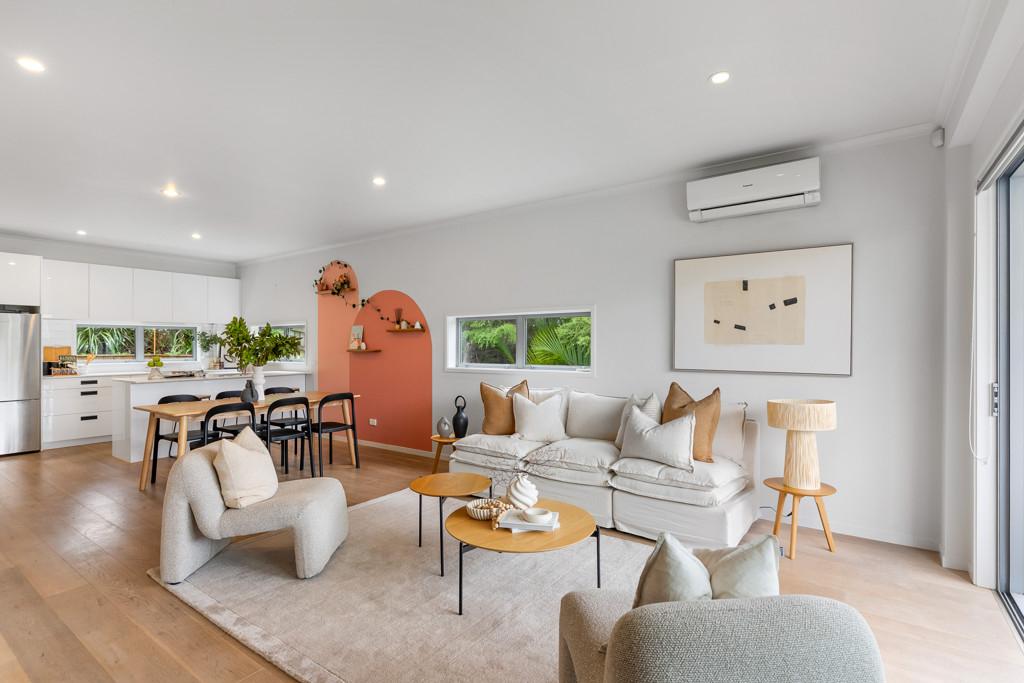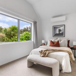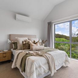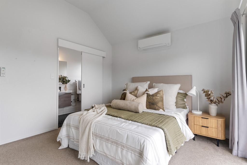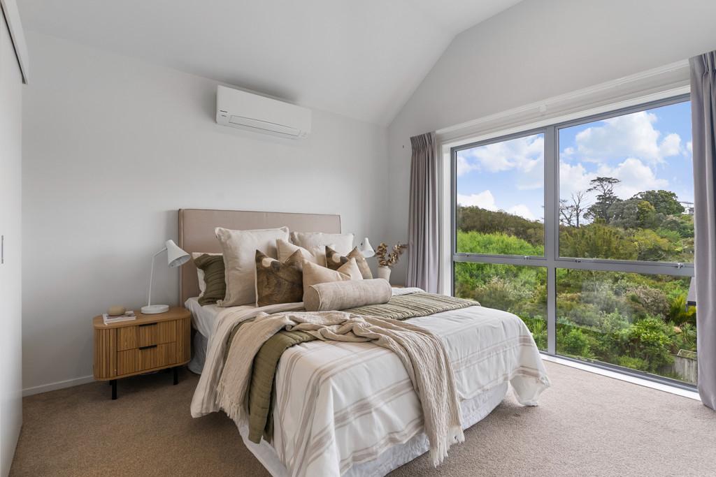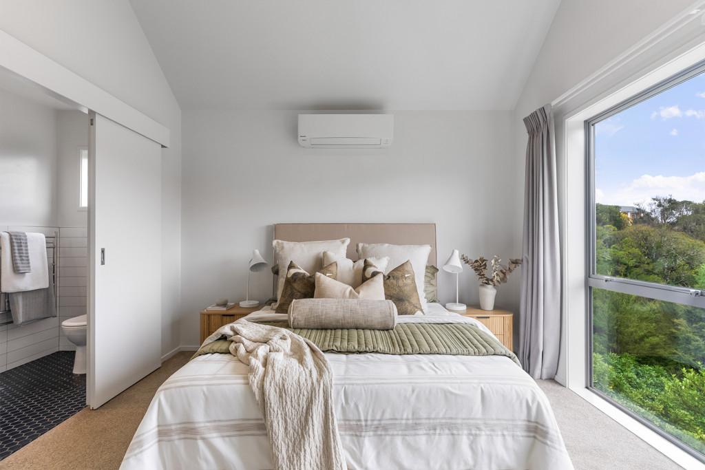 On the top floor, three bedrooms provide excellent separation from the living spaces. The master retreat impresses with a vaulted ceiling, heat pump, and picture window framing peaceful bush views - a feature unique to No. 15, arguably the best position in the development. A sleek ensuite and stylish family bathroom complete the layout.