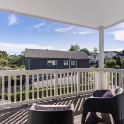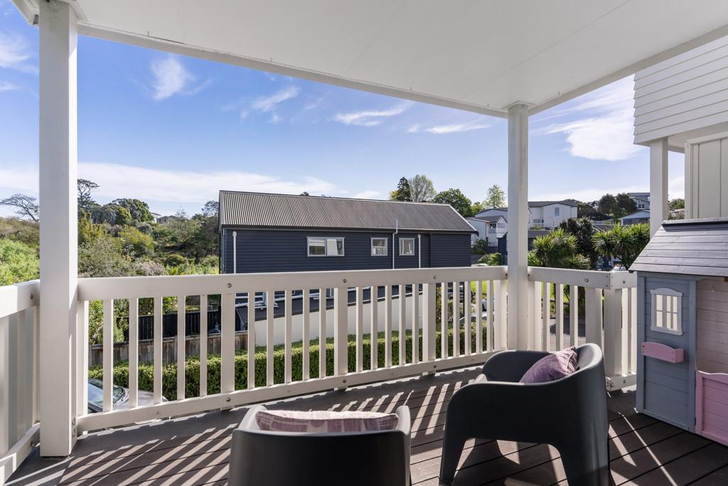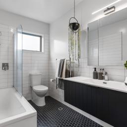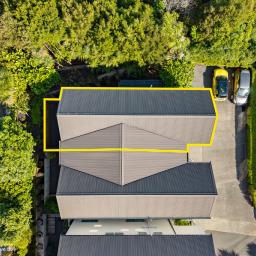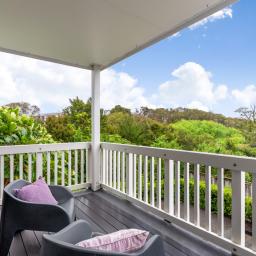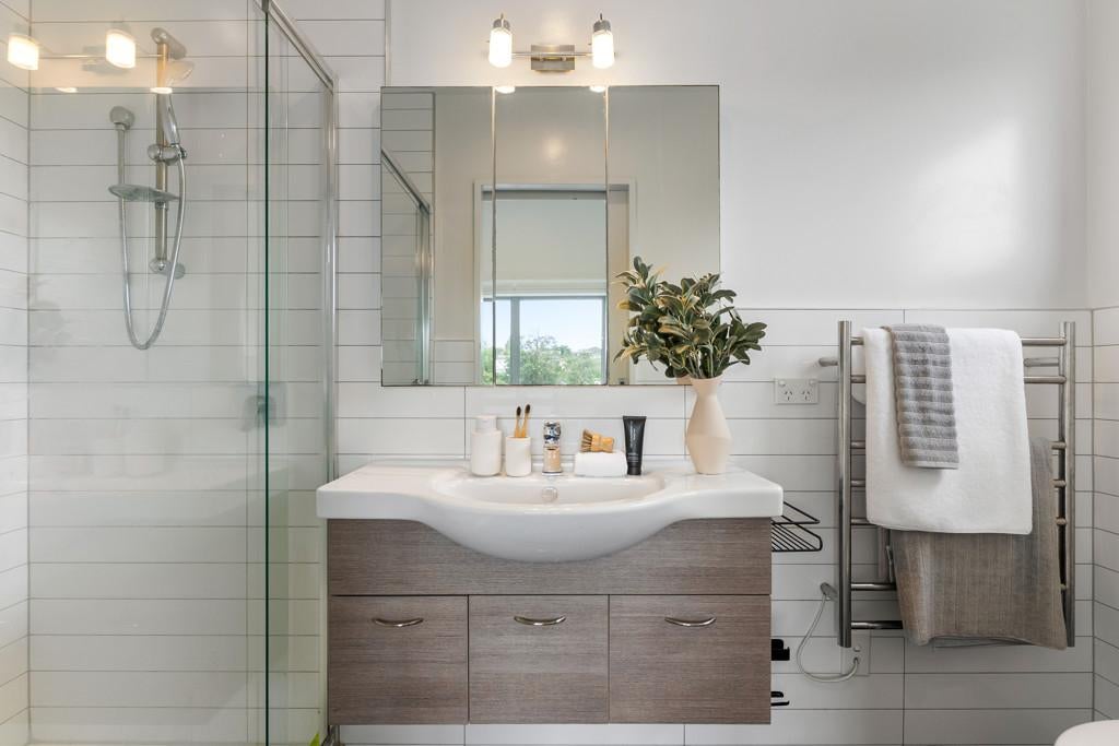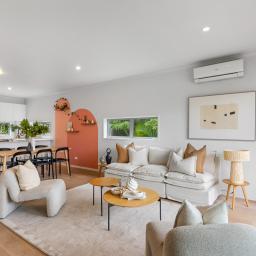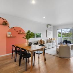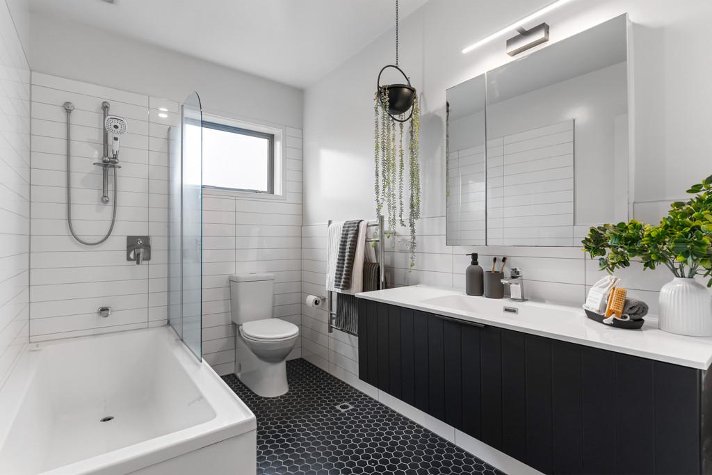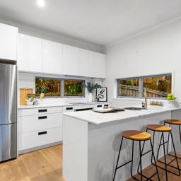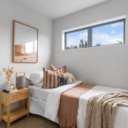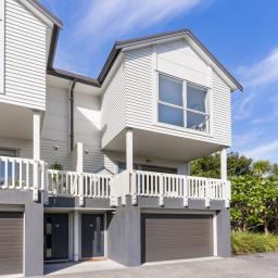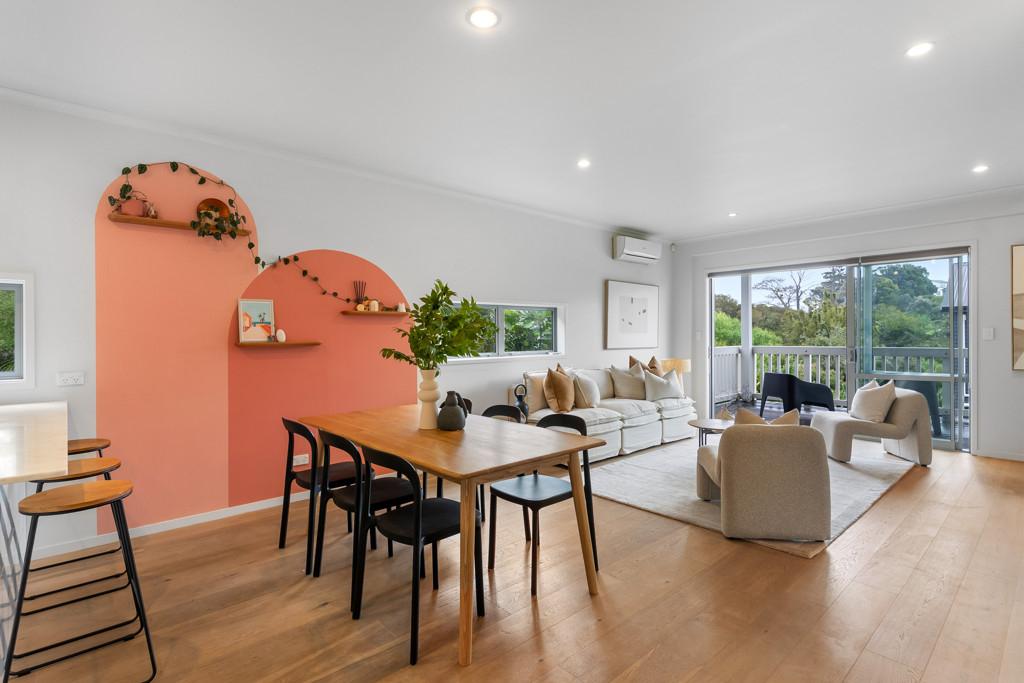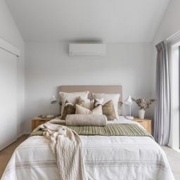 On the top floor, three bedrooms provide excellent separation from the living spaces. The master retreat impresses with a vaulted ceiling, heat pump, and picture window framing peaceful bush views - a feature unique to No. 15, arguably the best position in the development. A sleek ensuite and stylish family bathroom complete the layout.