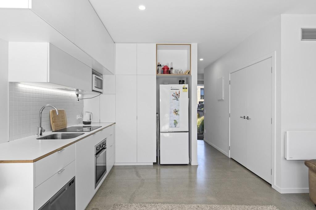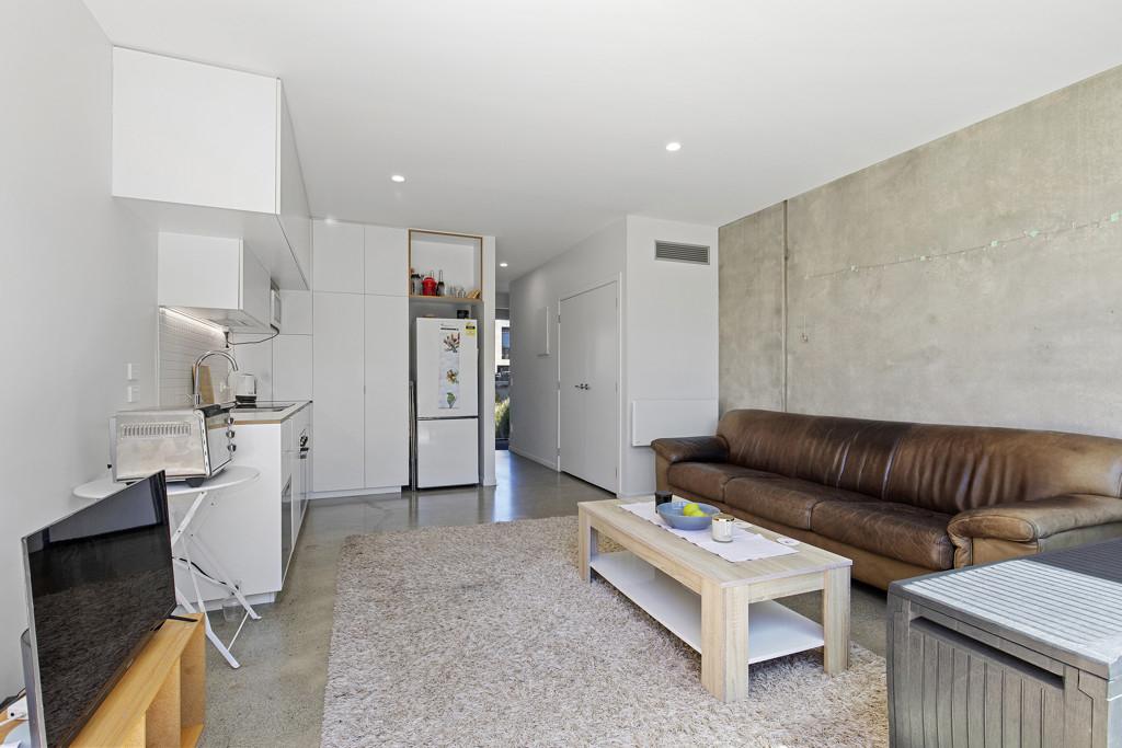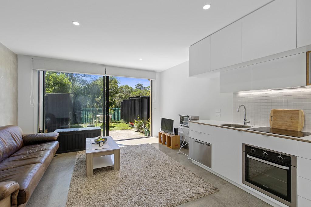 The open plan living has a feeling of spaciousness with a high stud and large sliding doors offering excellent indoor/outdoor connection to take advantage of that private back area.
