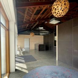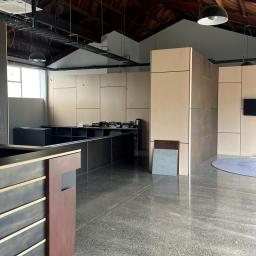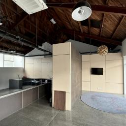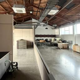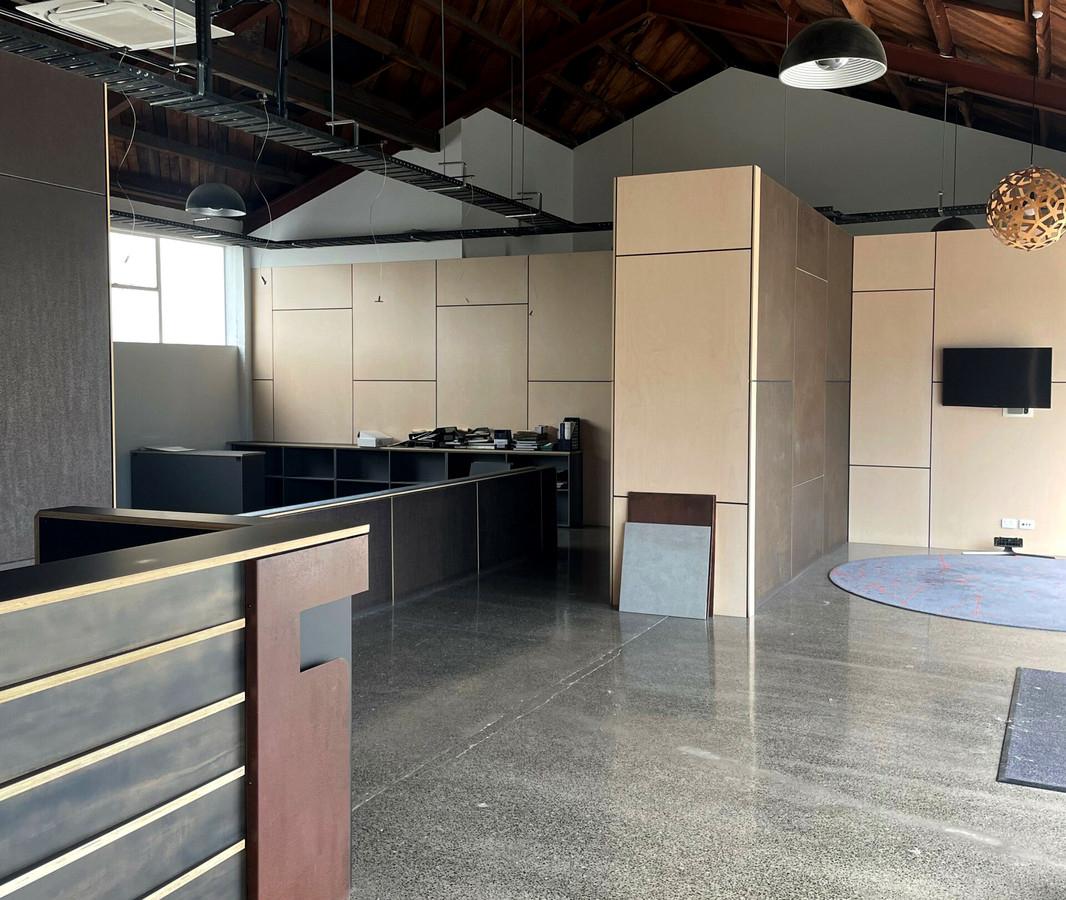 This 175m² boutique office perfectly blends industrial character with modern functionality, featuring polished concrete floors, exposed timber ceilings, and abundant natural light.