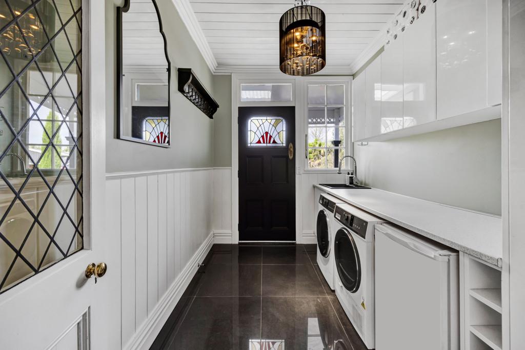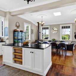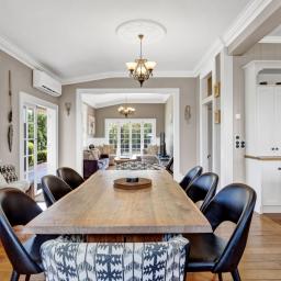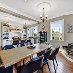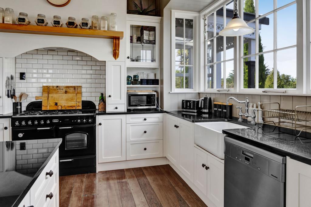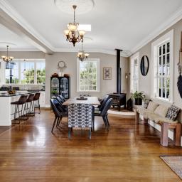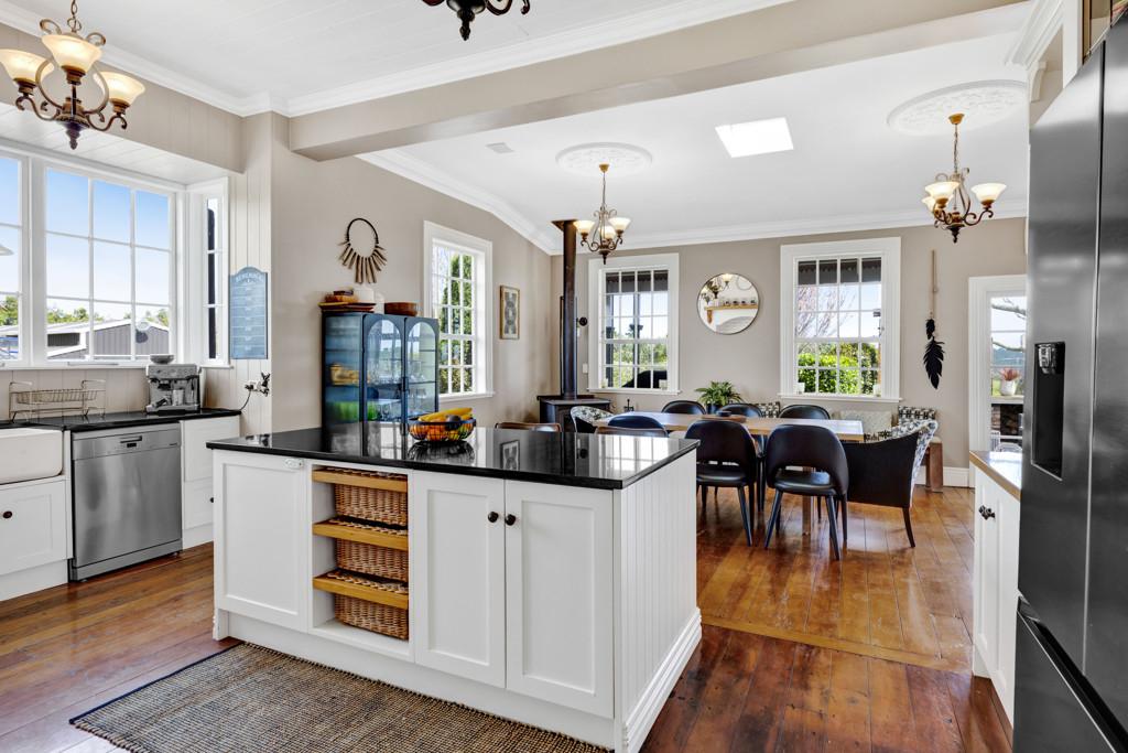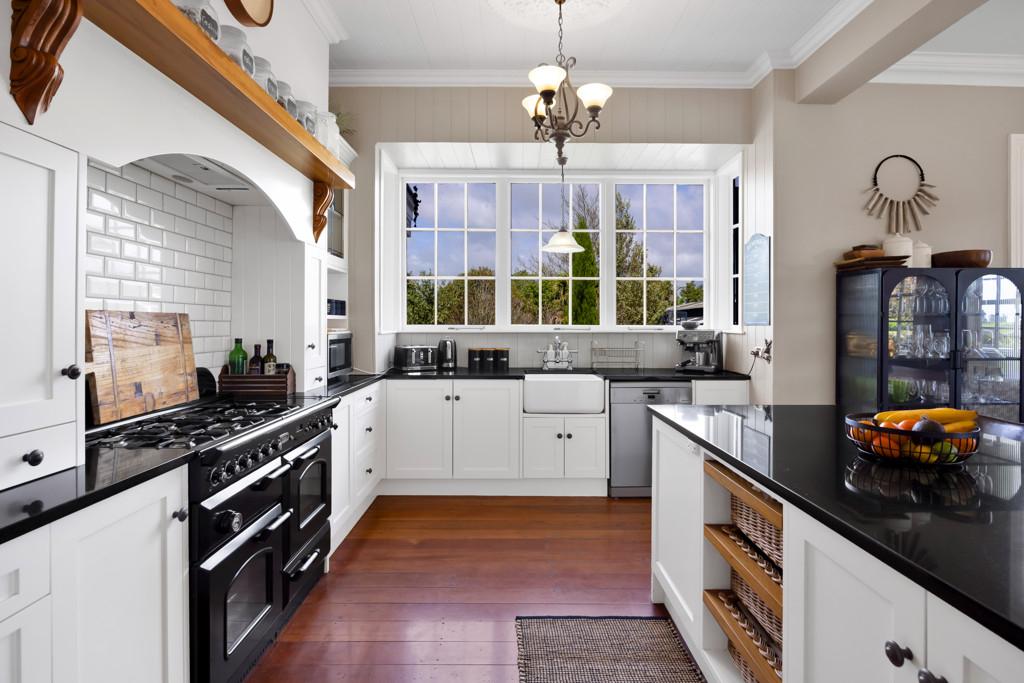 Both bathrooms have been tastefully upgraded using heritage-inspired fittings and premium finishes. The country-style kitchen features a double Falcon oven, stone benchtops, and a traditional butler sink, flowing into the open plan living and dining area. A log burner, heat pump, insulation ceiling & underfloor, and HRV system ensure year-round comfort.