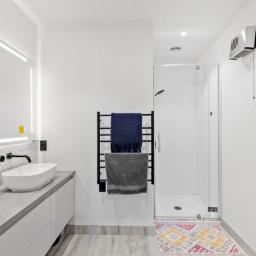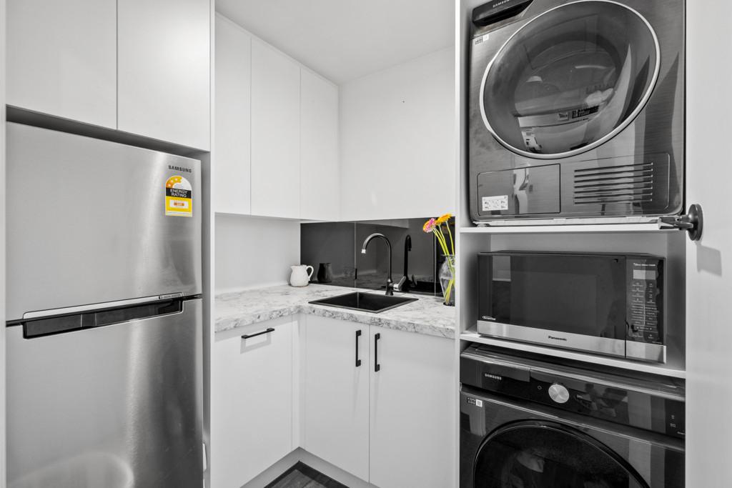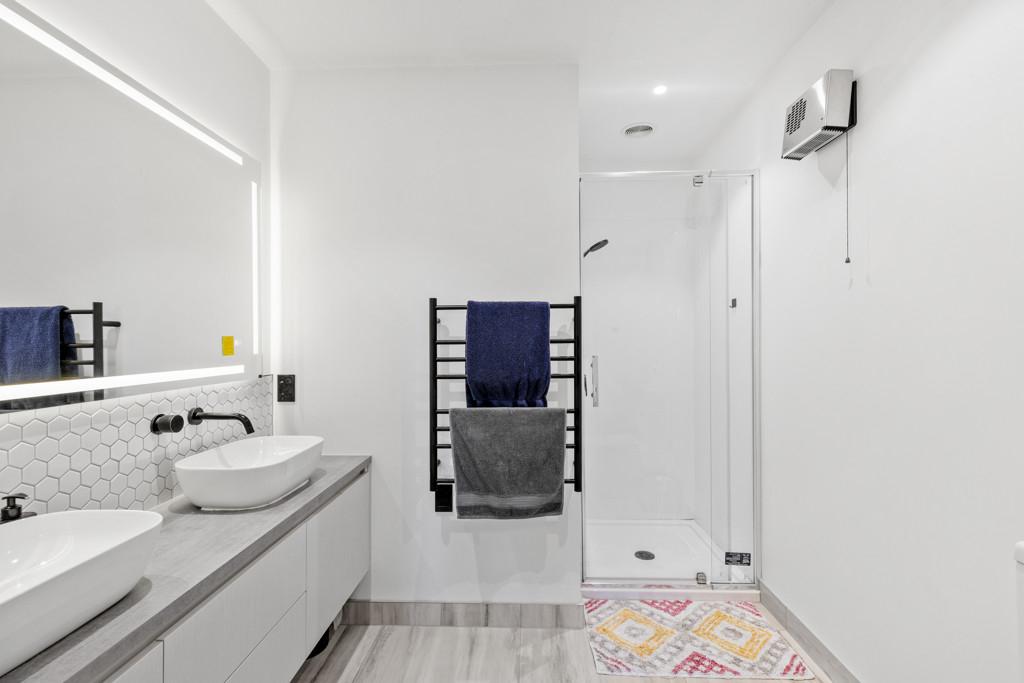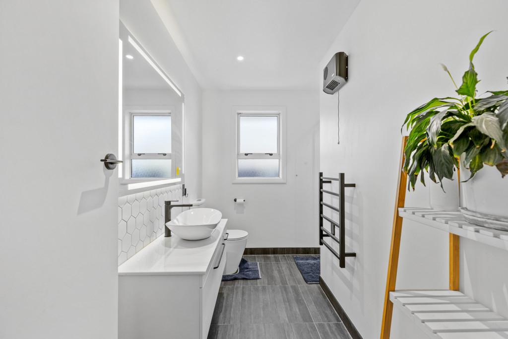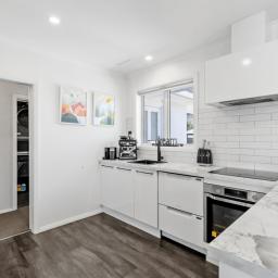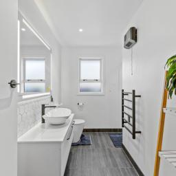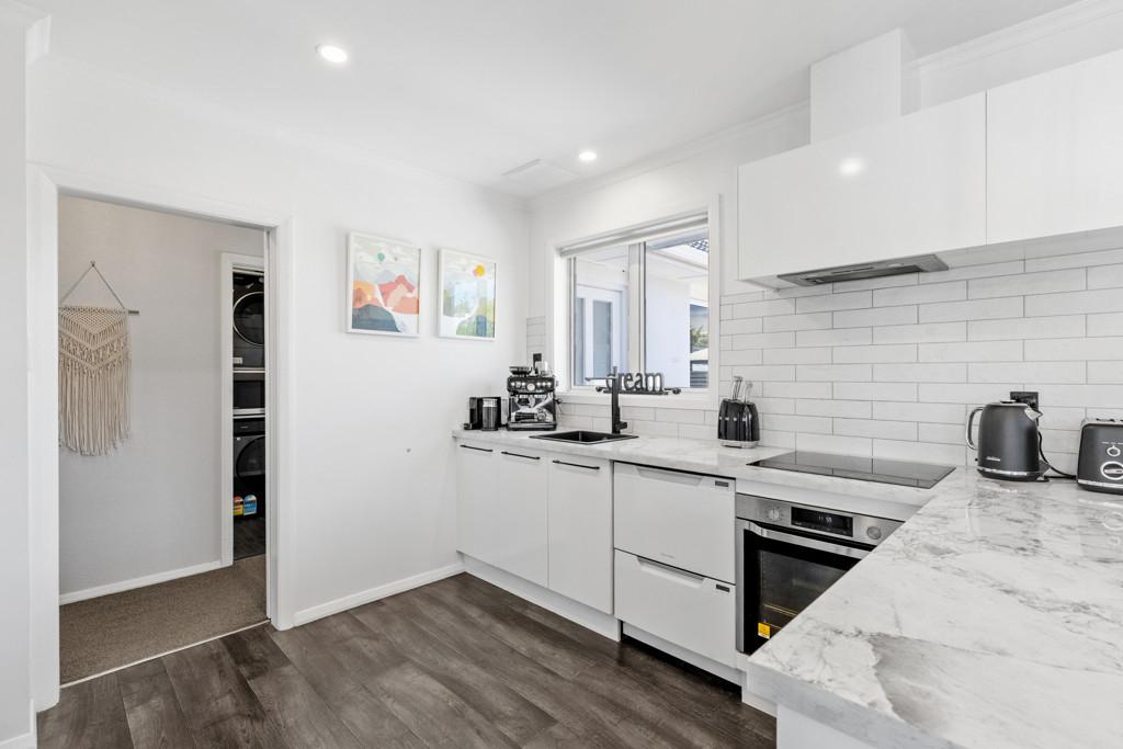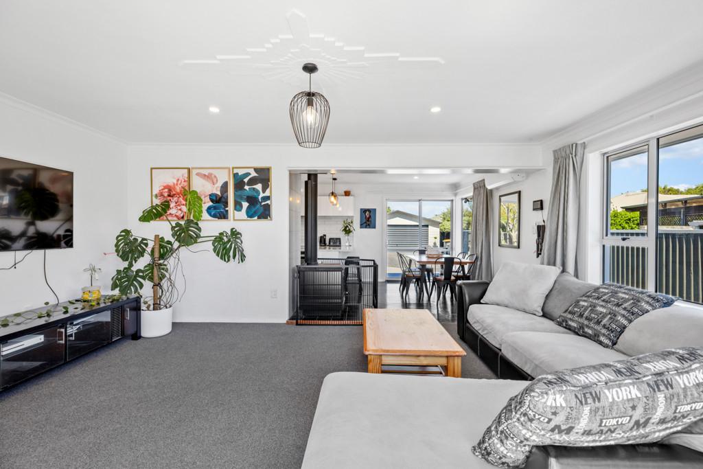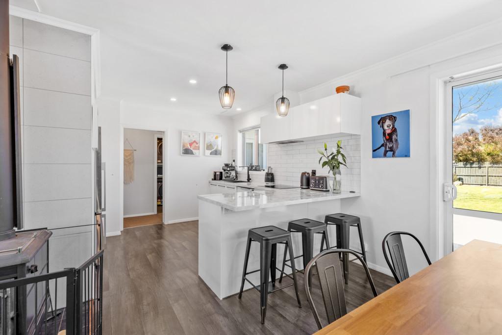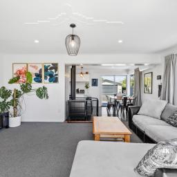 Inside, you'll find the heart of the home - a connected living, kitchen, and dining space that flows seamlessly outdoors to two different entertaining areas. The contemporary kitchen features sleek cabinetry, quality appliances, and a generous breakfast bar as well as a plumbed fridge space. A wetback wood burner accompanied by a heat transfer system ensures the home stays cosy through the cooler months, as well as full double glazing throughout.