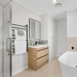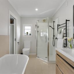 • Modern bathroom with shower and bathtub