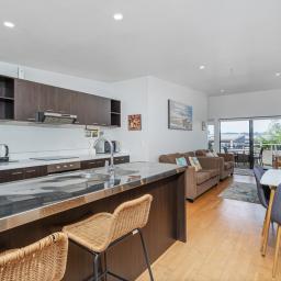 End of terrace with it's own private entrance, the ground floor has the main bathroom and two bedrooms, the master with a balcony. The well appointed, open plan living/kitchen is upstairs, light & bright having extra windows, all opening out to a covered deck. Conveniently furnished, and has 2 carparks along with separate storage.