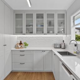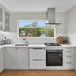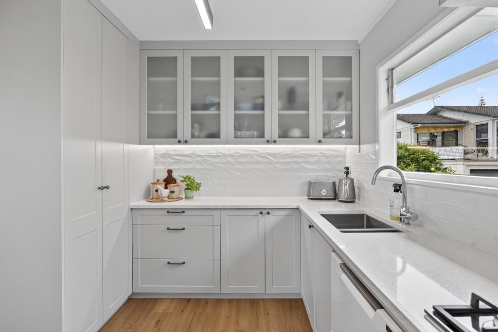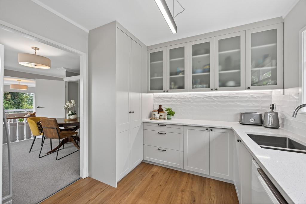 The renovated kitchen gleams with crisp cabinetry, quality fittings, and clever storage, a space that makes everyday living feel just that little bit special.