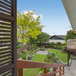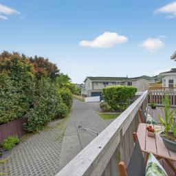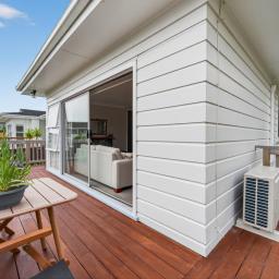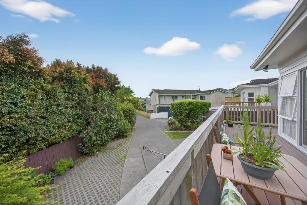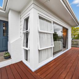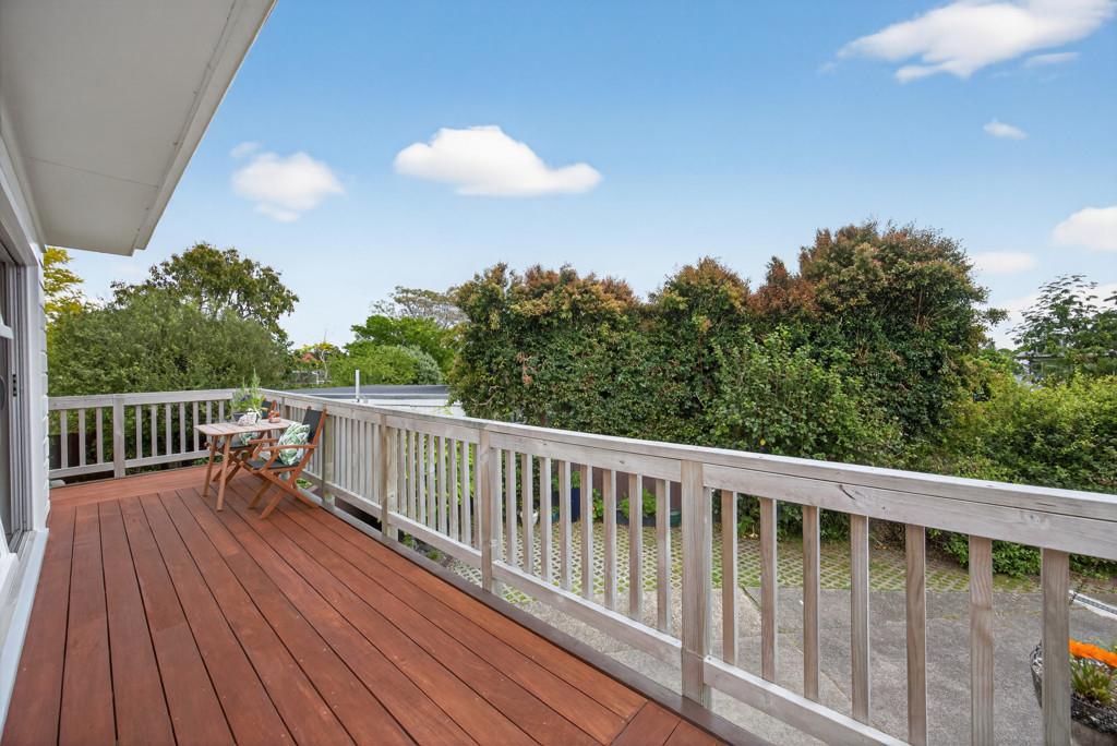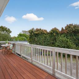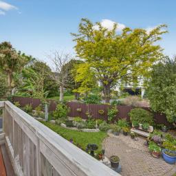 The elevated deck captures views of the surrounding greenery, while the courtyard garden below offers space for barbecues, relaxing, or simply soaking up the sunshine.