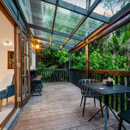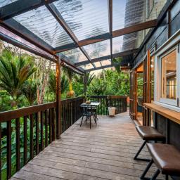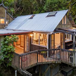 Step outside and the sense of wonder deepens. The deck opens to an enchanting garden that feels like a world of its own. A pergola shaded by mature trees, a gentle stream where eels glide over mossy stones, glow worms that shimmer after dark and soft moss underfoot all create the kind of childhood memories money cannot buy. A flying fox stretches across the garden and a treehouse den adds even more excitement for young explorers.