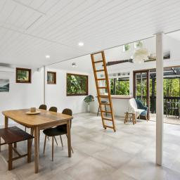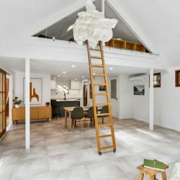 A sturdy ladder leads to a mezzanine hideaway, an irresistible spot for adventurous kids and just as ideal for a home office or creative retreat. Every space feels intentional, polished and full of personality.