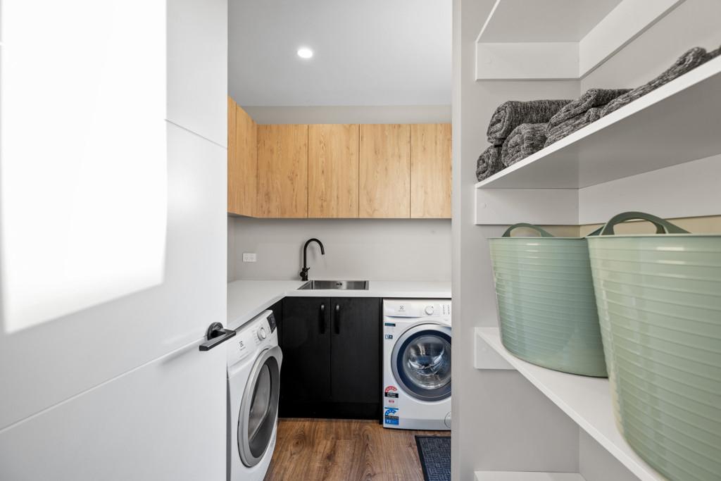 Practicality meets style with a dedicated laundry, bag and coat nook, and double garage featuring an attic ladder leading to a large additional storage area. Outdoors, there's ample off-street parking, including space for a motorhome or caravan. The easy-care landscaping is enhanced by a Rainbird automated irrigation system and garden shed.
