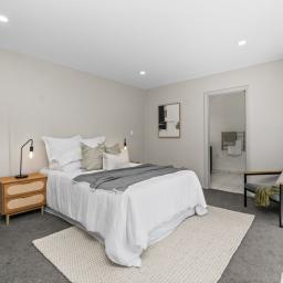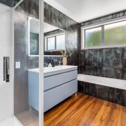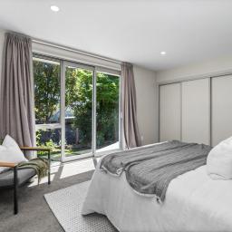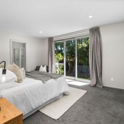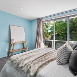 Three spacious bedrooms all open directly to the outdoors, inviting sunshine and fresh air into daily life. The central main living area connects the home and is warmed by a heat pump, while rich Rimu timber floors add timeless warmth and texture.