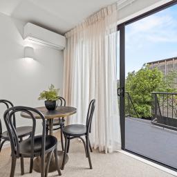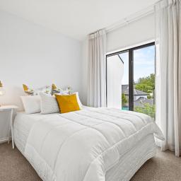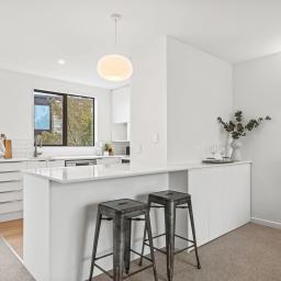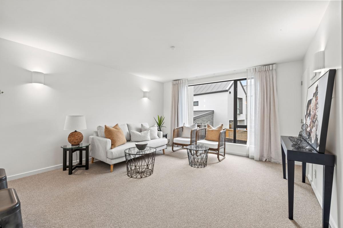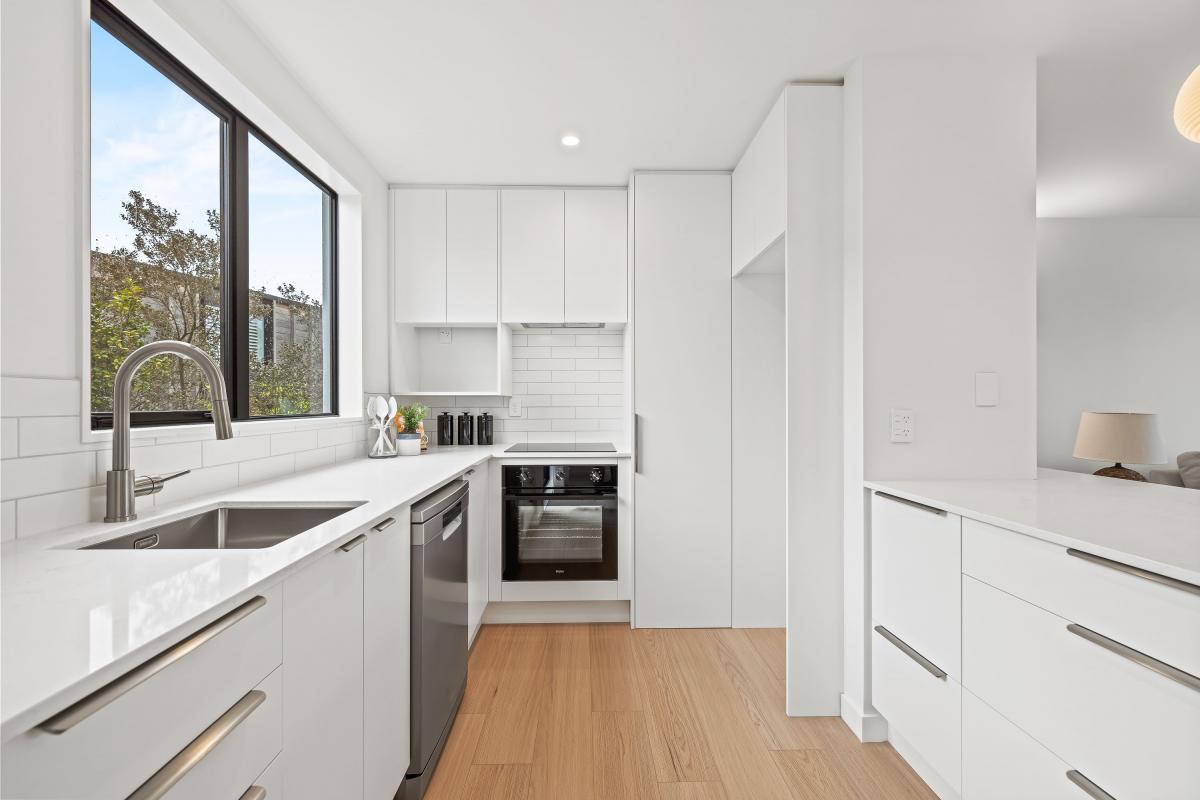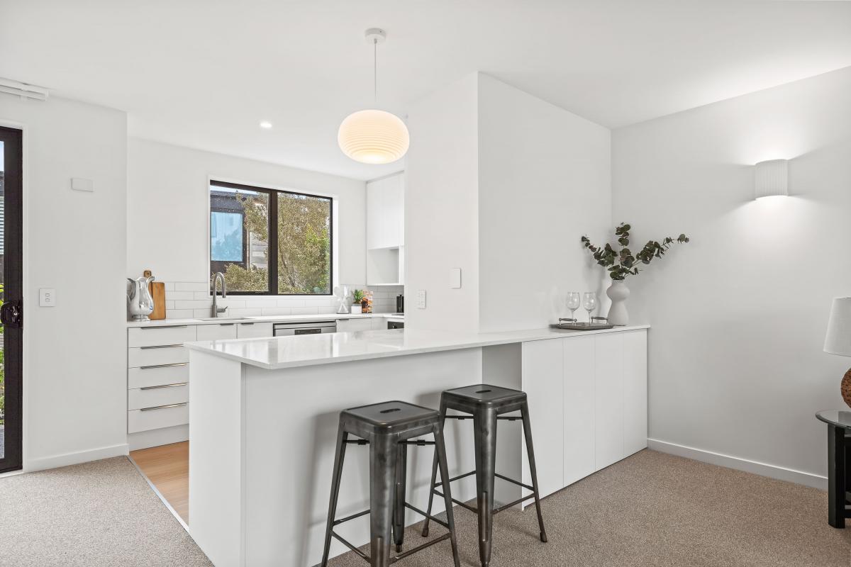 Upstairs, the living level offers effortless flow through open-plan lounge and dining spaces, complemented by a sleek, streamlined kitchen. A north-facing balcony extends the living area outdoors, capturing light and warmth throughout the day.