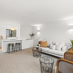 Privately positioned in an exclusive, gated, block of four, the ground floor delivers exceptional practicality with a drive-through internal-access garage that opens to a private courtyard, complemented by a discreetly concealed laundry.