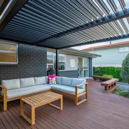 Both living areas flow seamlessly to the outdoor entertaining space, where adjustable louvers provide all-weather comfort for year-round enjoyment. Whether it’s a relaxed weekend barbecue or evening drinks with friends, this inviting area is designed for effortless indoor-outdoor living.