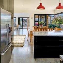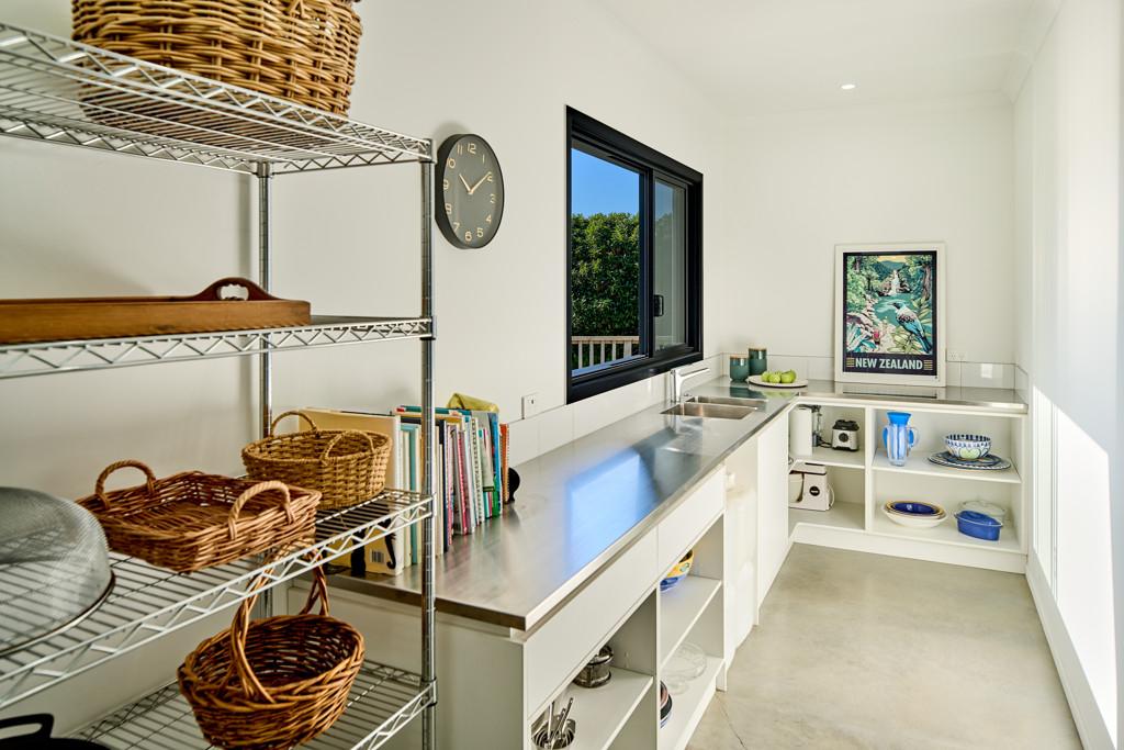 - Open-plan kitchen with granite benchtops, induction hob, and galley-style scullery