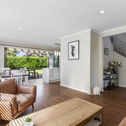 The open plan design exudes contemporary elegance, with generous living and dining zones anchored by a sleek designer kitchen and walk in pantry. Beyond the kitchen, the spacious rear yard extends from a covered deck ideal for year round entertaining, while the expansive lawn offers space to relax, and the perfect setting to explore the possibilities of adding a pool in the future, completing a vision of a private resort style haven.