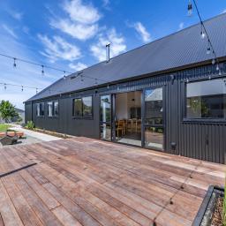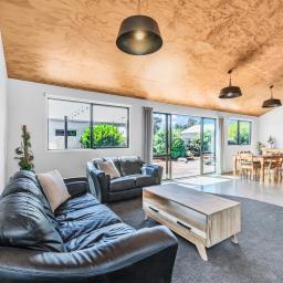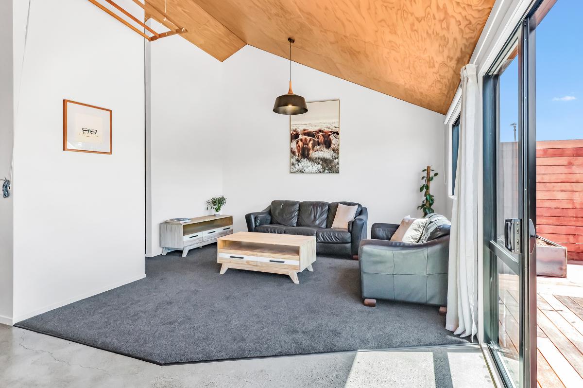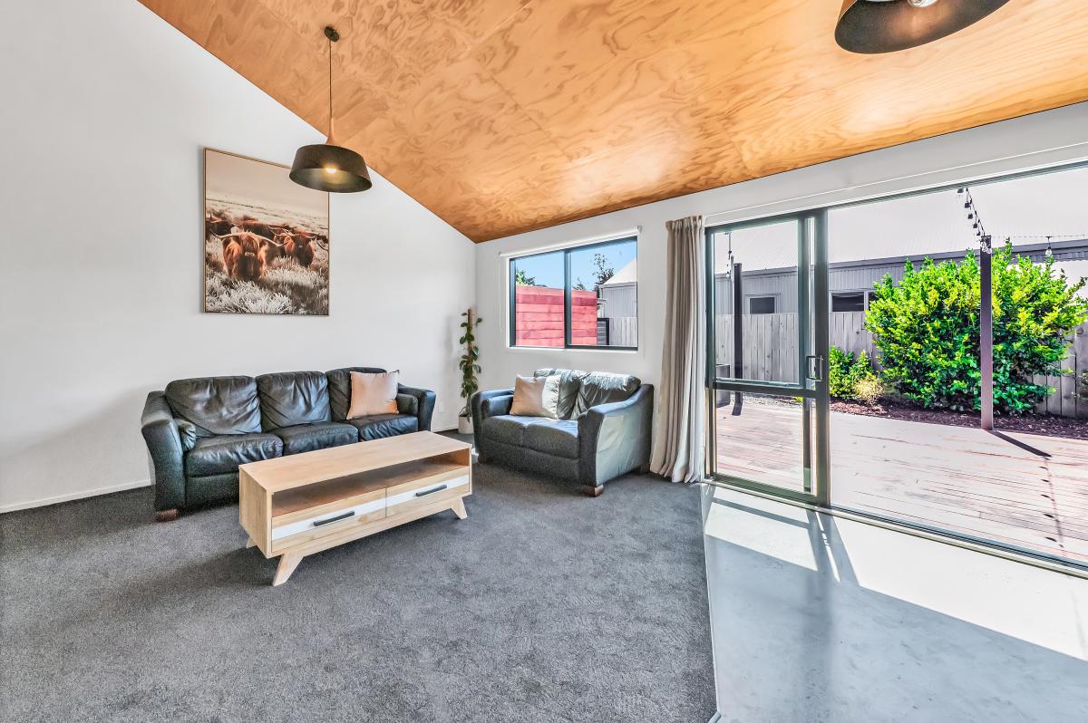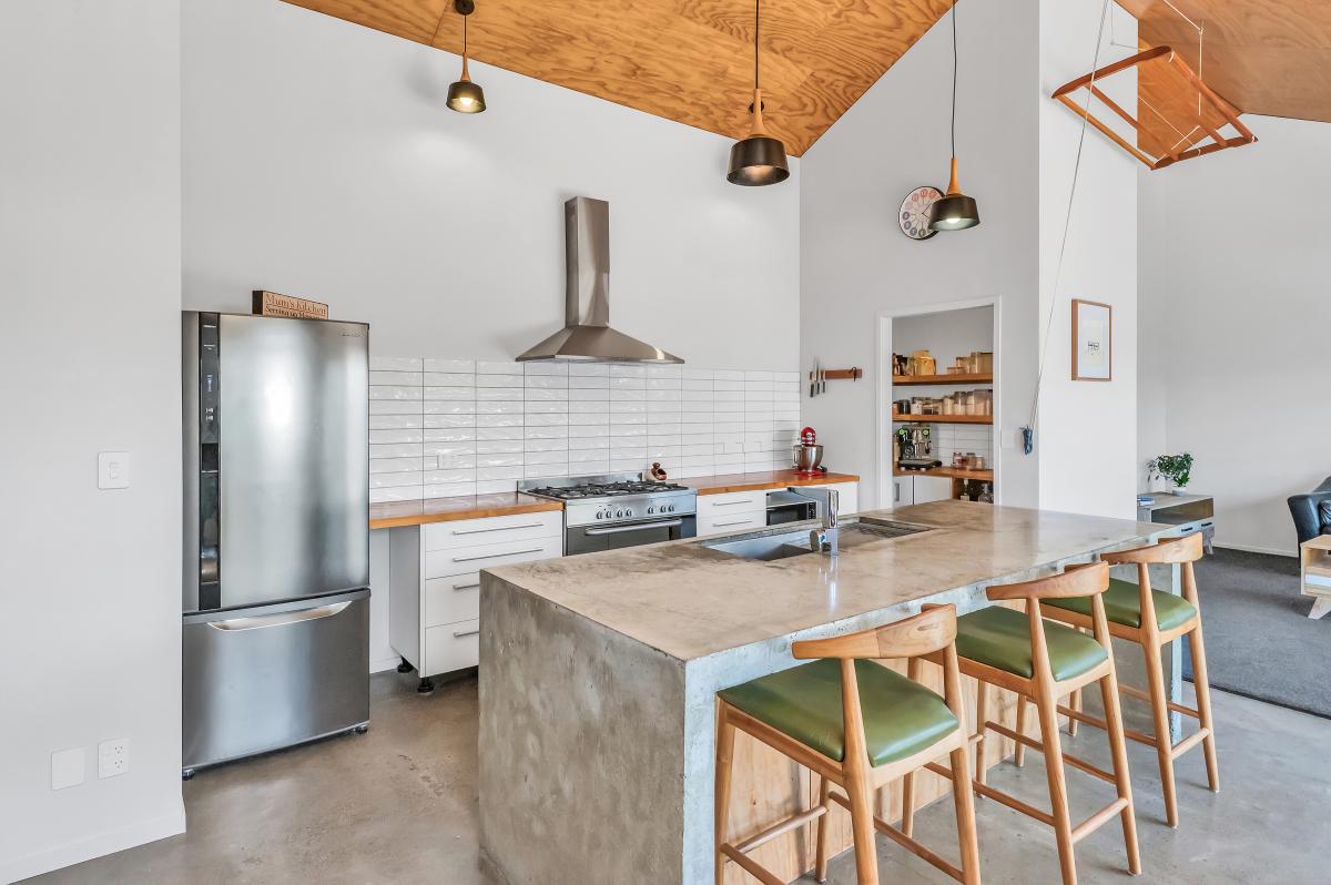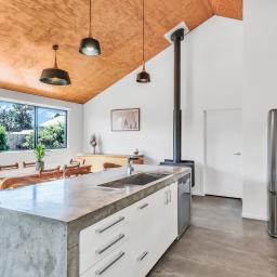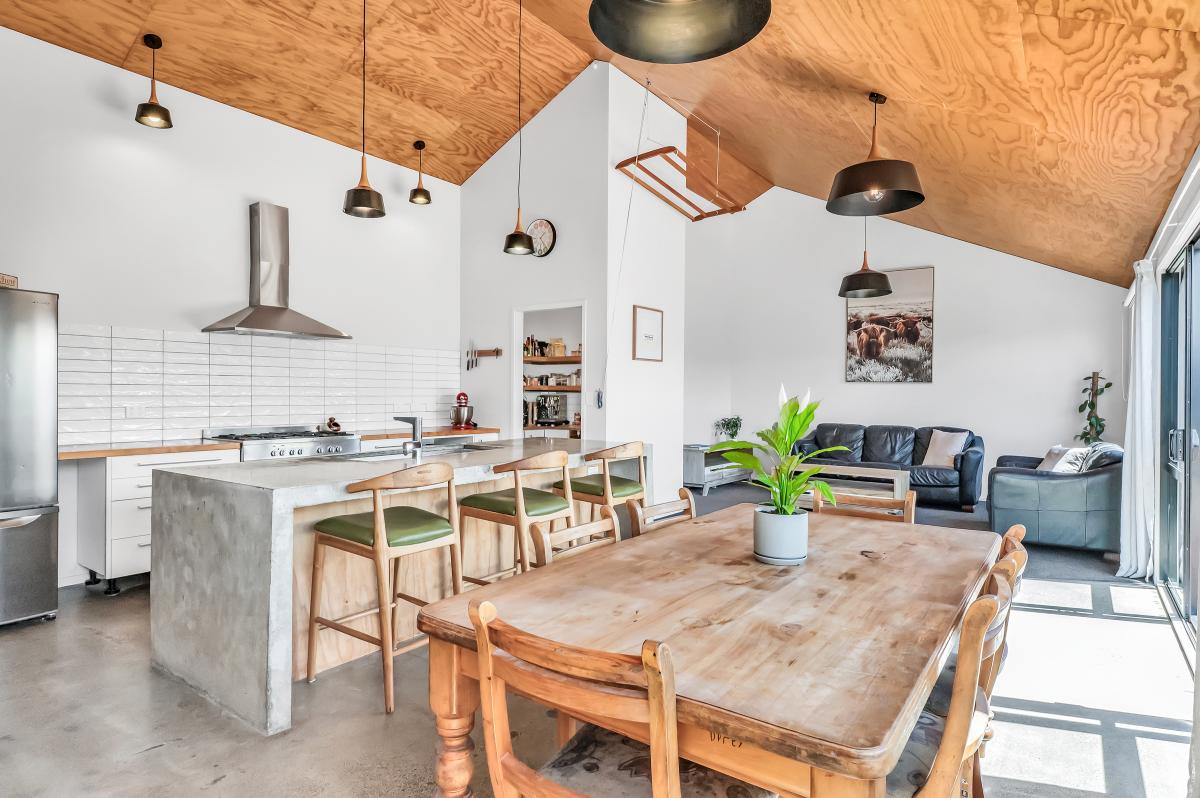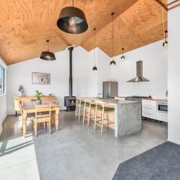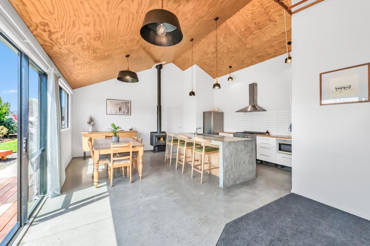 The open-plan layout brings together kitchen, dining and living spaces beneath a soaring plywood ceiling, anchored by a concrete island bench and log burner (with wetback). Sliding doors extend the living outdoors to a generous deck and BBQ area — the perfect setting for evening gatherings under the festoon lights or quiet weekends around the firepit.
