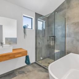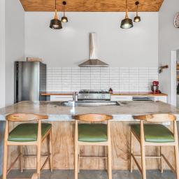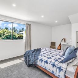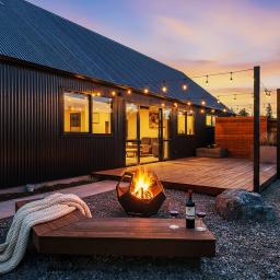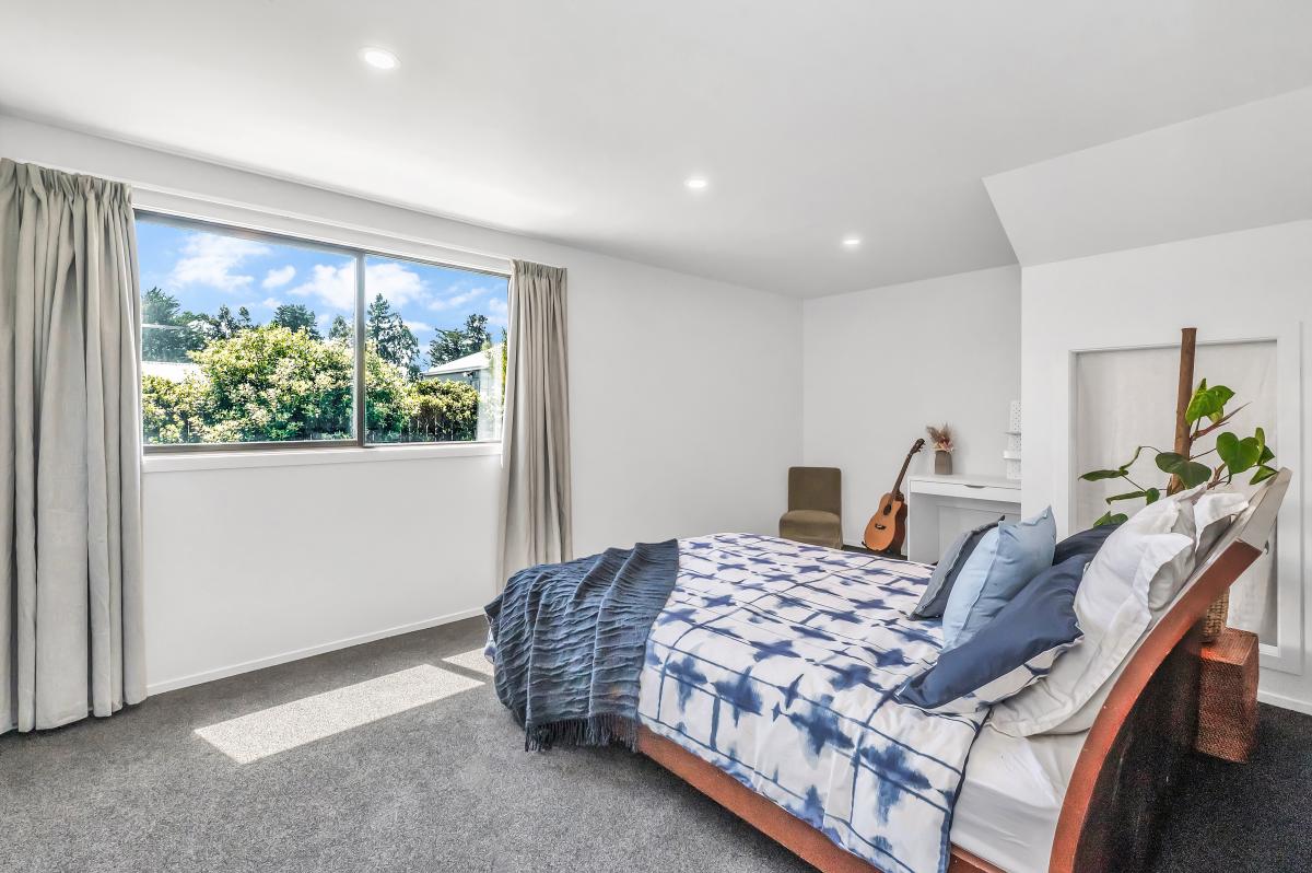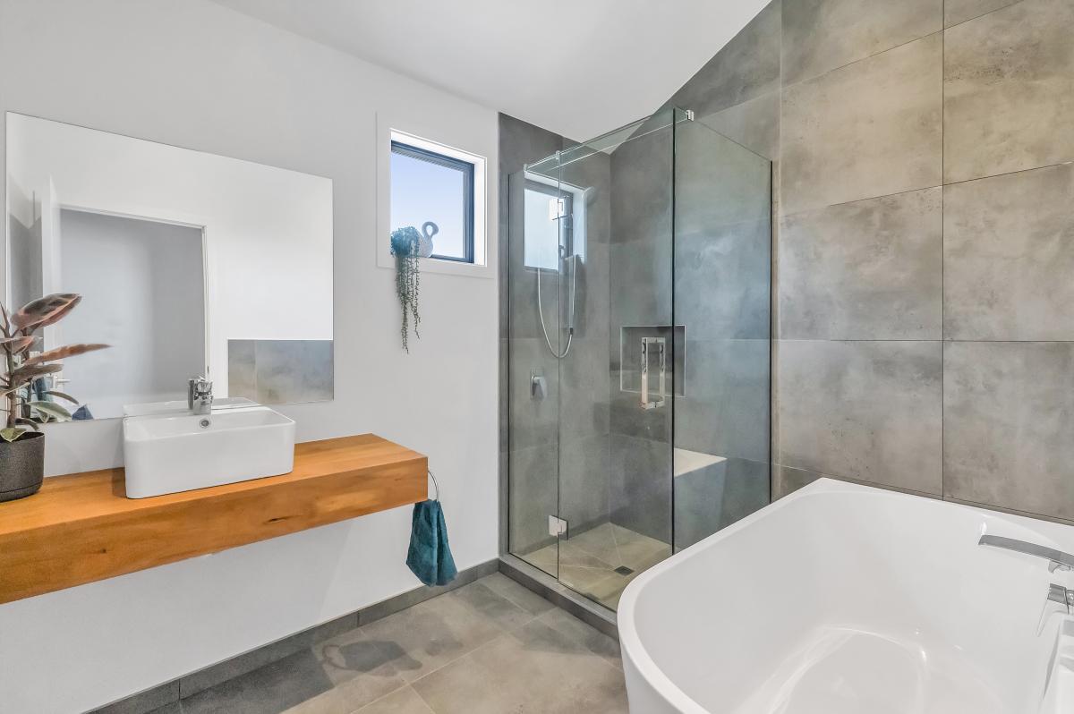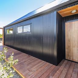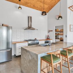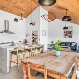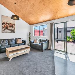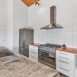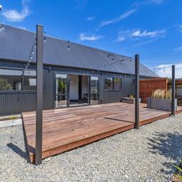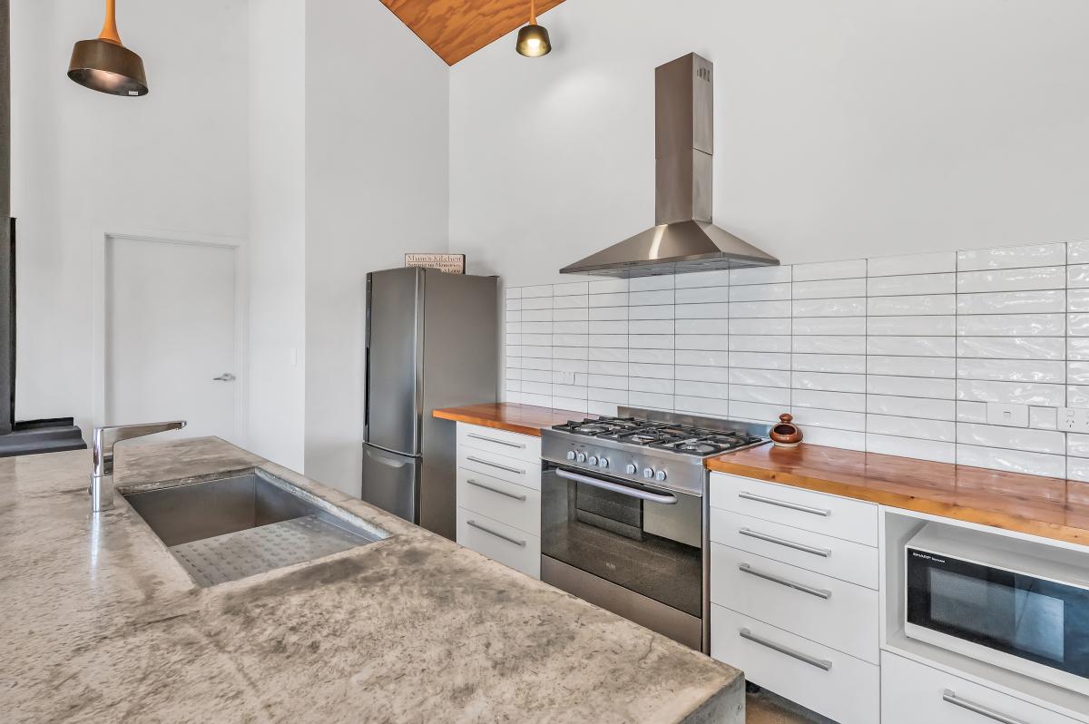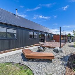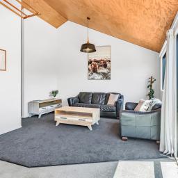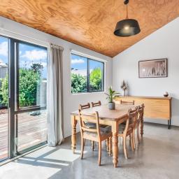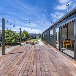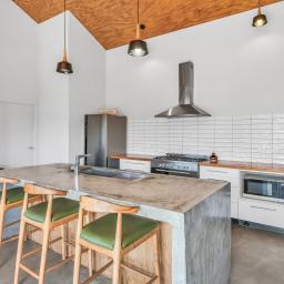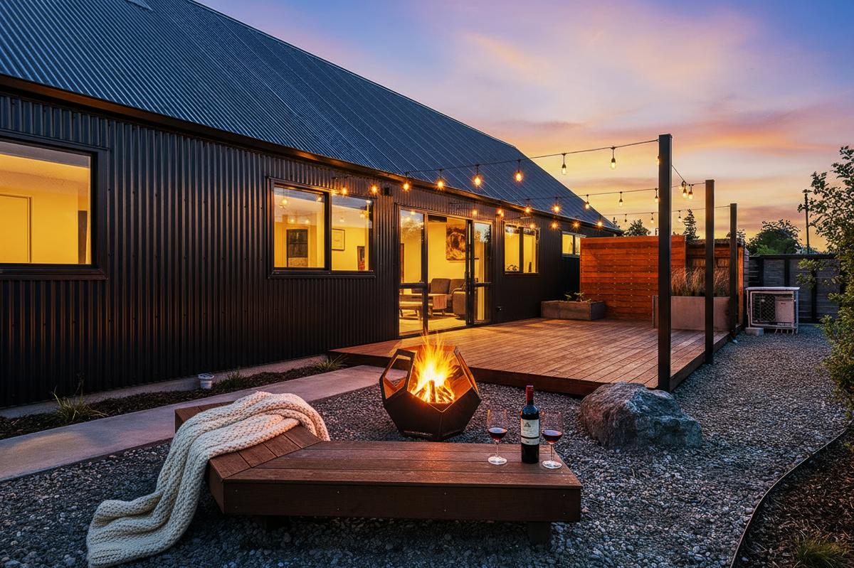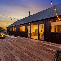 The open-plan layout brings together kitchen, dining and living spaces beneath a soaring plywood ceiling, anchored by a concrete island bench and log burner (with wetback). Sliding doors extend the living outdoors to a generous deck and BBQ area — the perfect setting for evening gatherings under the festoon lights or quiet weekends around the firepit.
