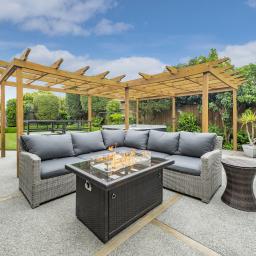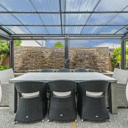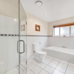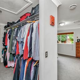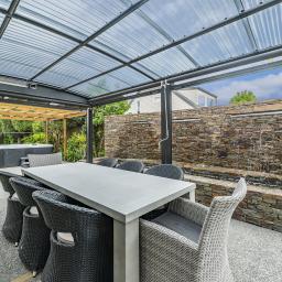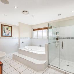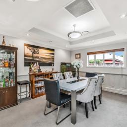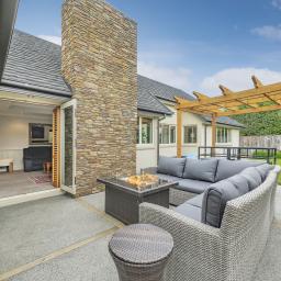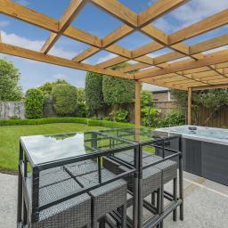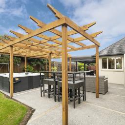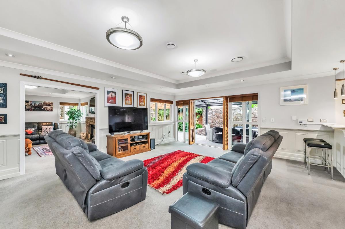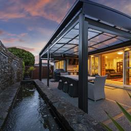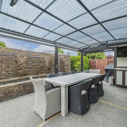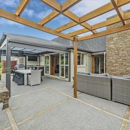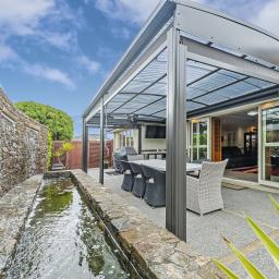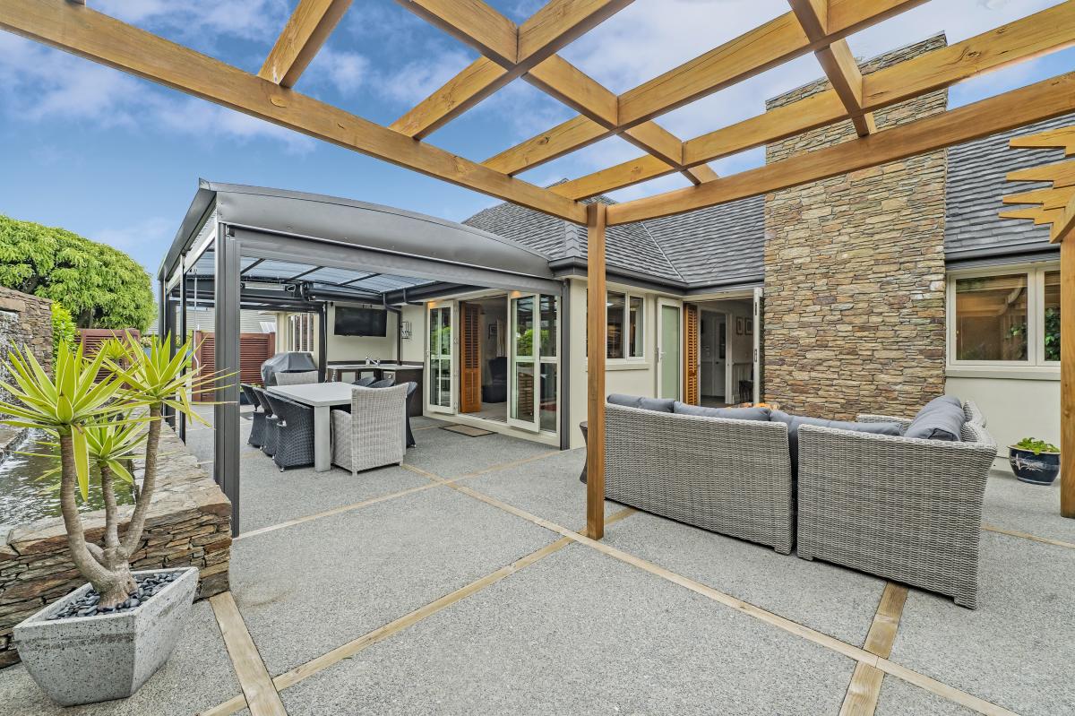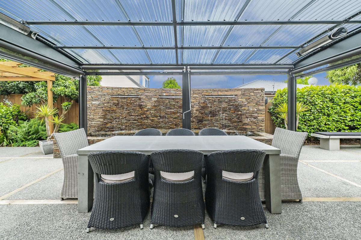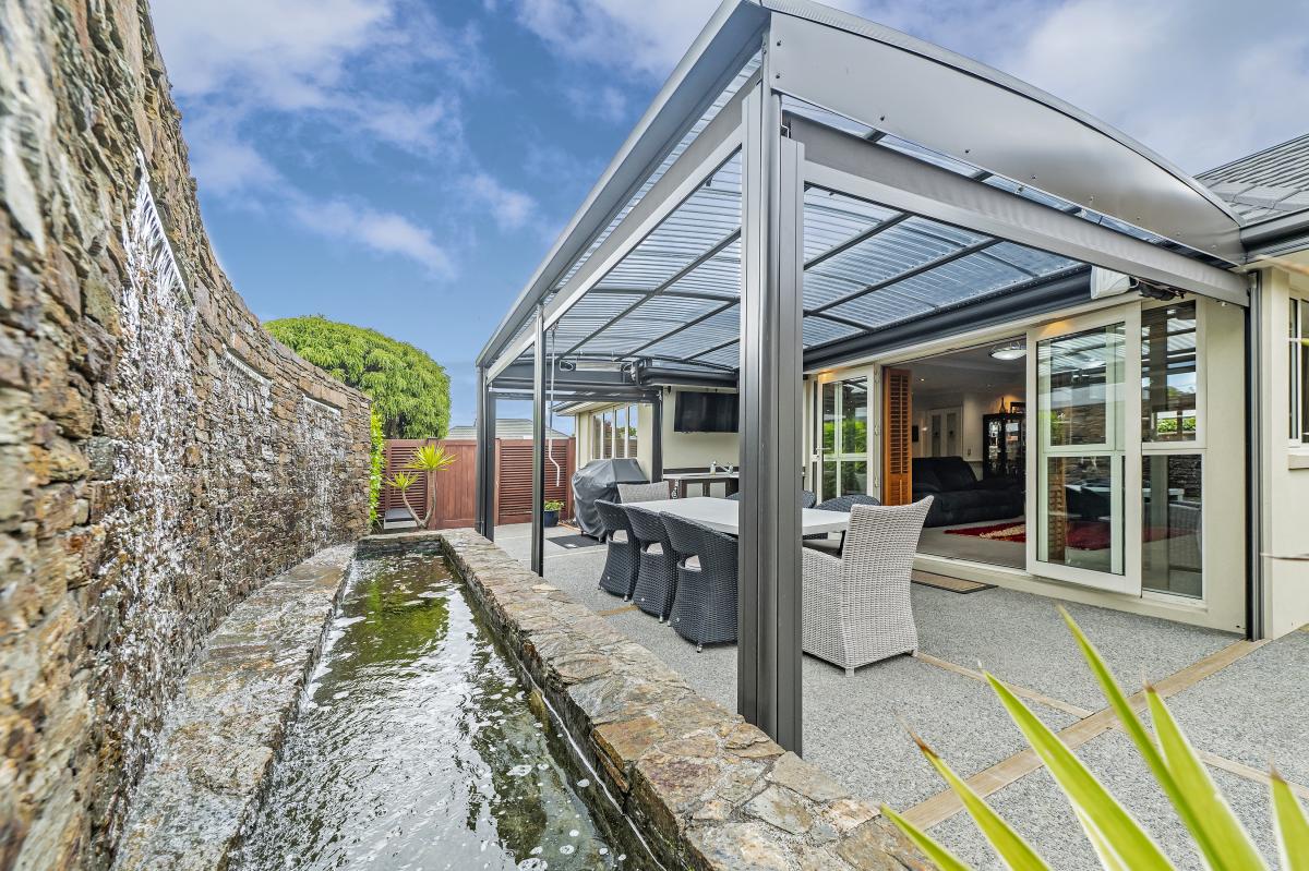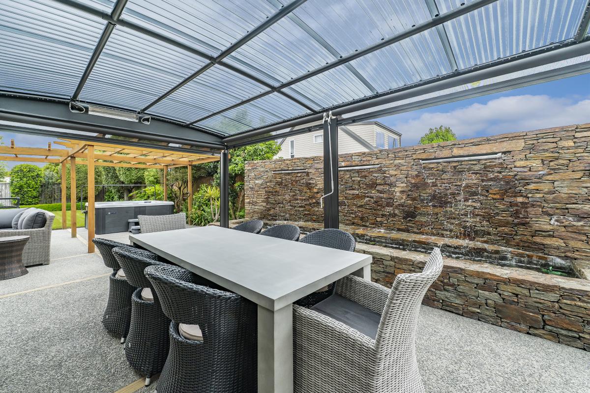 The home's piece de resistance is the covered outdoor entertaining area, featuring a stunning schist water feature, Archgola with roller blinds, and a pergola, all placed perfectly on an enormous exposed aggregate concrete patio, accessed from both living rooms and a double opening serving window from the kitchen, perfect for year-round al fresco dining.